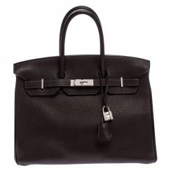 A bag that has become a hallmark of luxury and class, the Birkin from Hermes is one of the most coveted bags in the world. Custom-made on the suggestions of Jane Birkin, hence the namesake, this bag is aimed to fit the wants of the fast-paced life of modern women. Timeless design coupled with rich craftsmanship, the structured body of this Birkin 35 bag is crafted from Ebene Togo leather. Its foldover top is secured by palladium turn-lock closure, accompanied by a dangling lock and key which is safe within a leather clochette. The interior of the bag has leather lining and is equipped with a zip pocket for storing little essentials. Complete with dual-rolled handles and studs at the bottom, this bag is an investment that will last you for years.