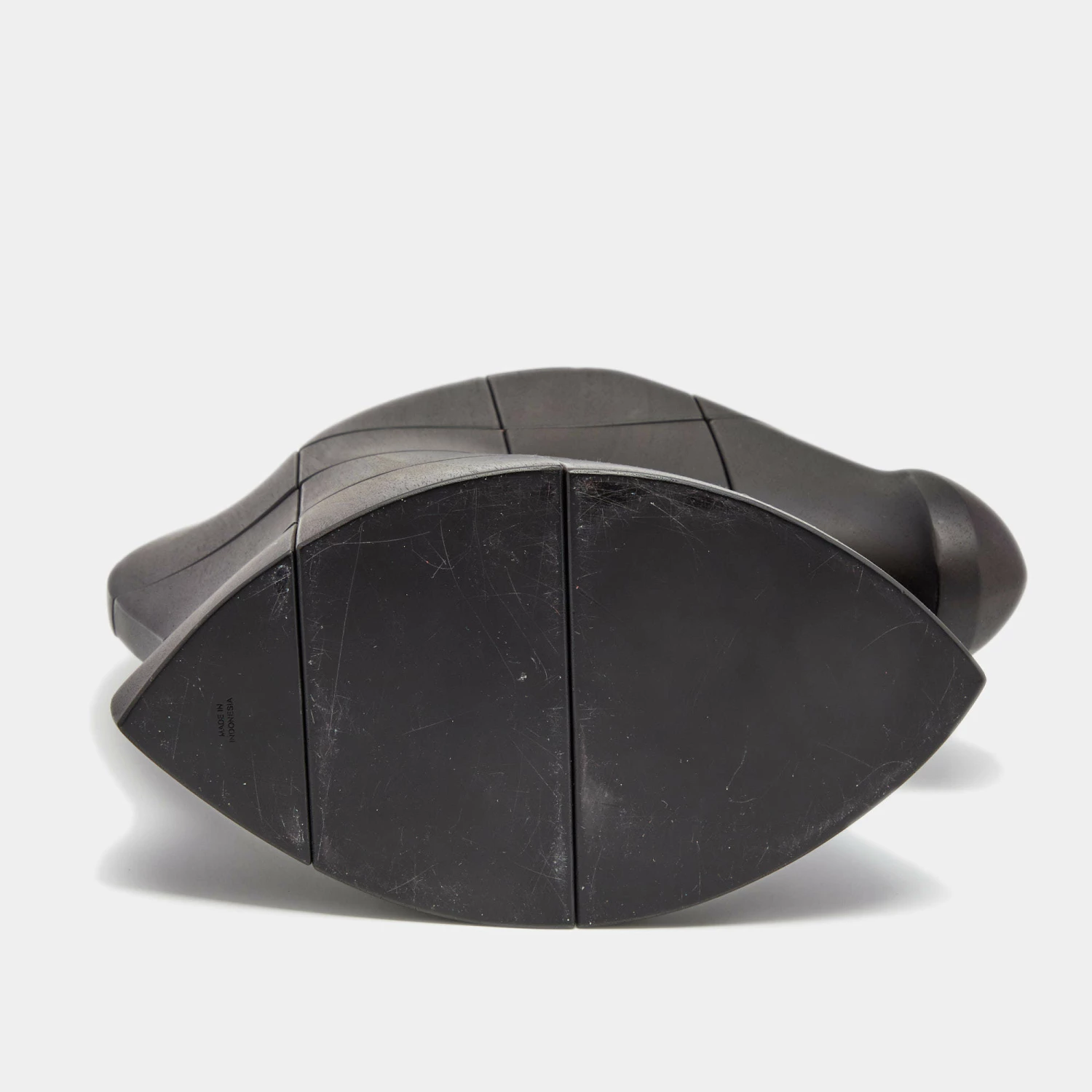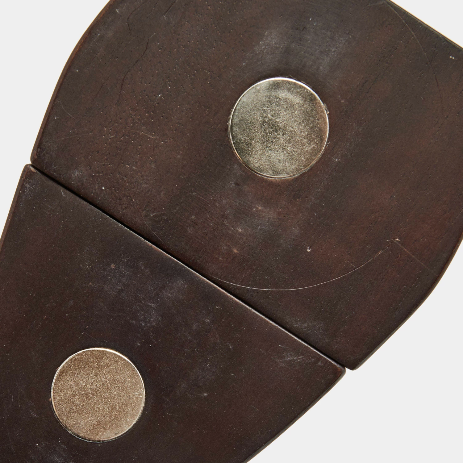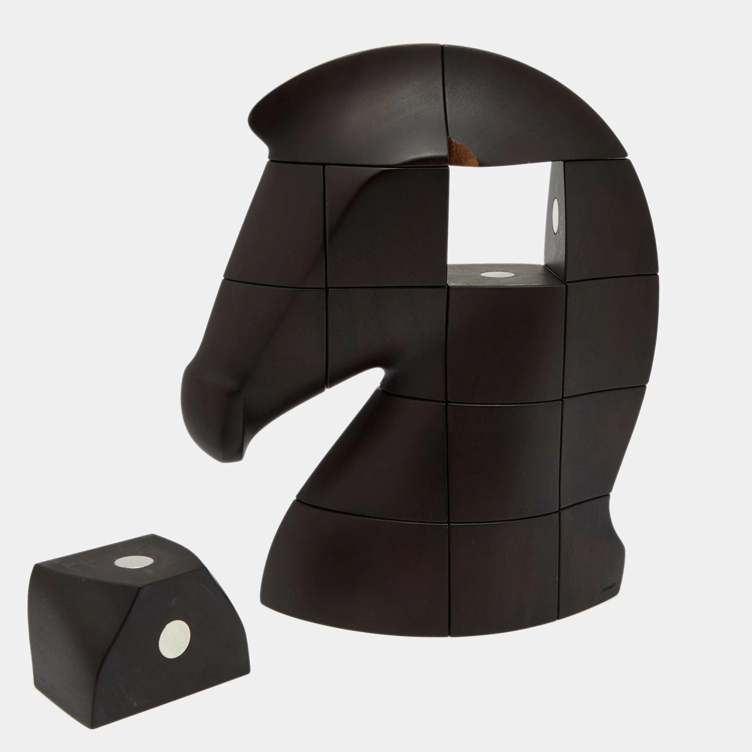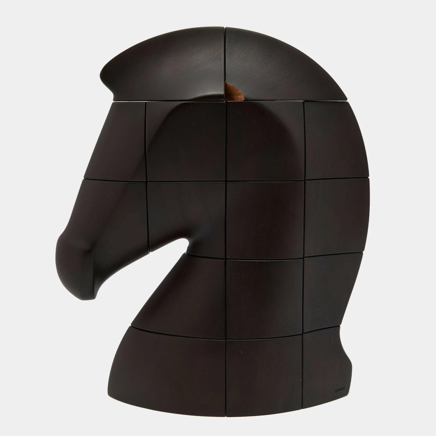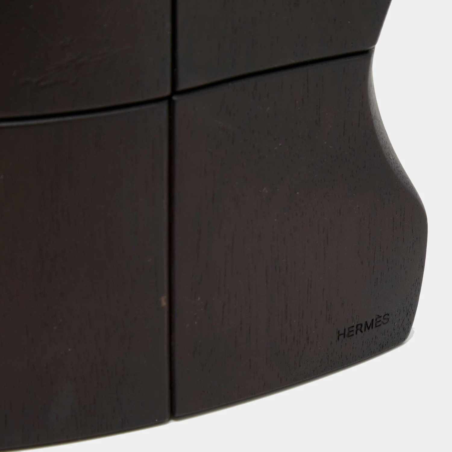 This Hermes Samarcande brainteaser sculpture is a paperweight in solid ebonized mahogany. The piece is carefully carved and fitted with magnets to be a fun puzzle-like game.
