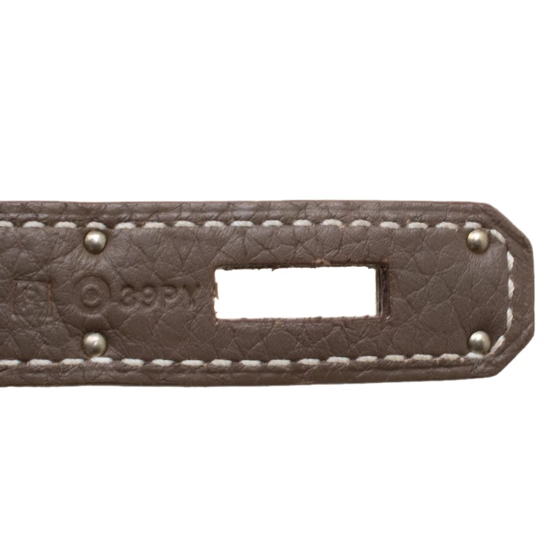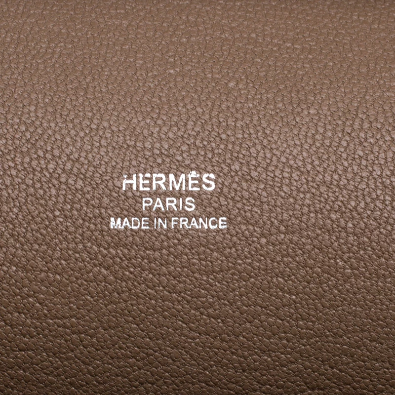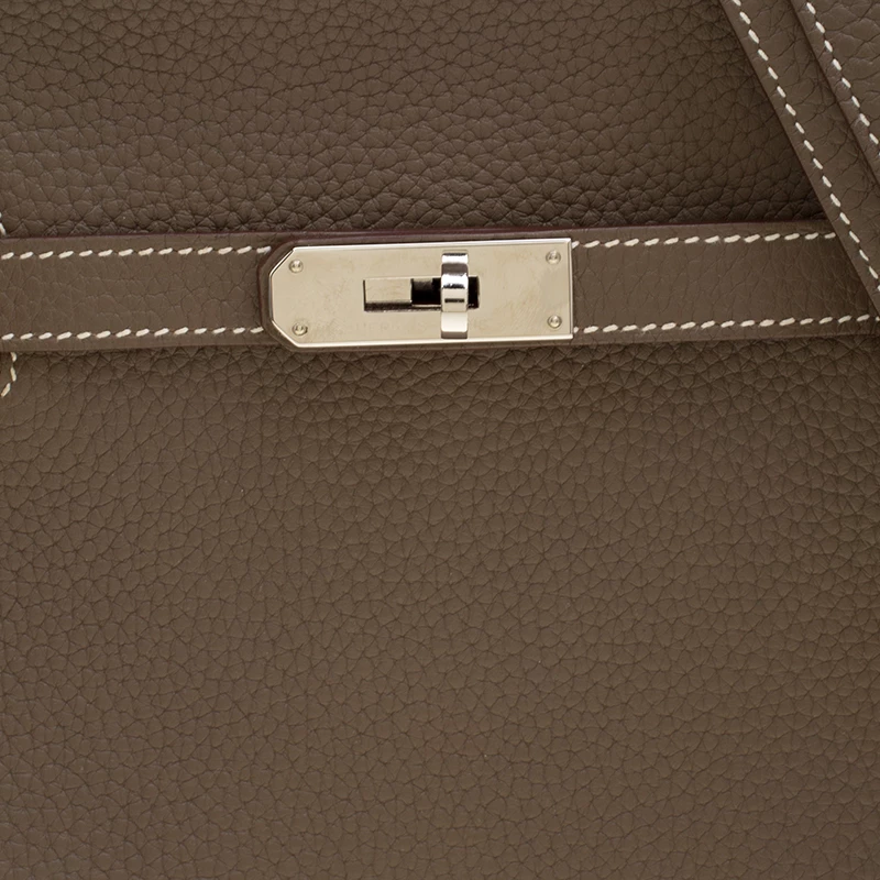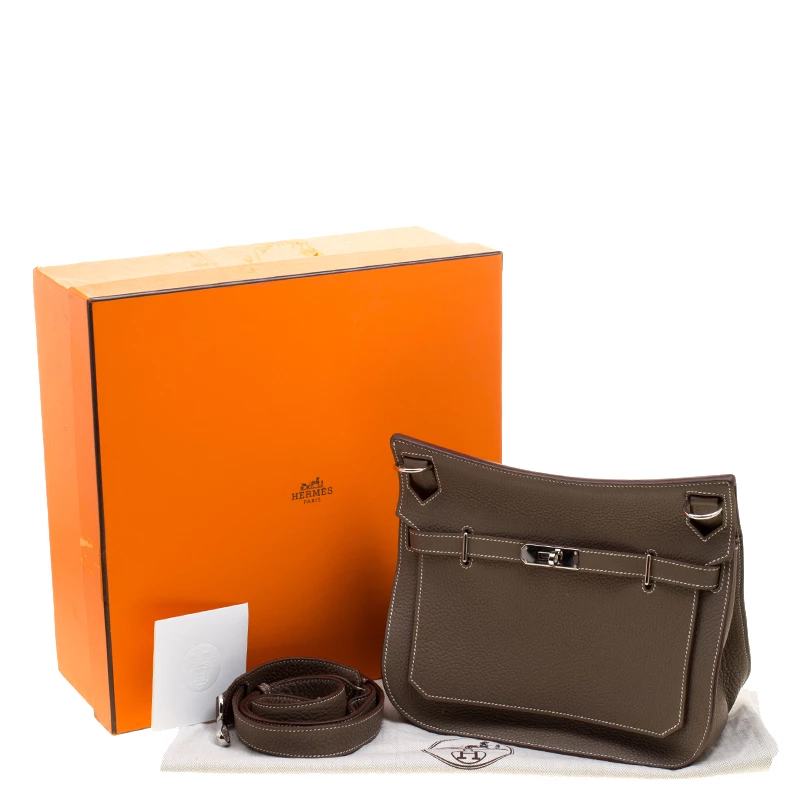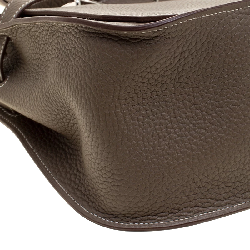 Hermes Jypsiere is a re-interpretation of the iconic Hermes Kelly. The messenger style bag is crafted from Etain Taurillon Clemence leather. The bag has a round bottom and features a thick adjustable shoulder strap that provides the needed comfort. The front flap has a turn lock closure and opens to a leather lined interior that houses two slip pockets and a zip pocket. This versatile bag can be worn over the shoulder or crossbody.