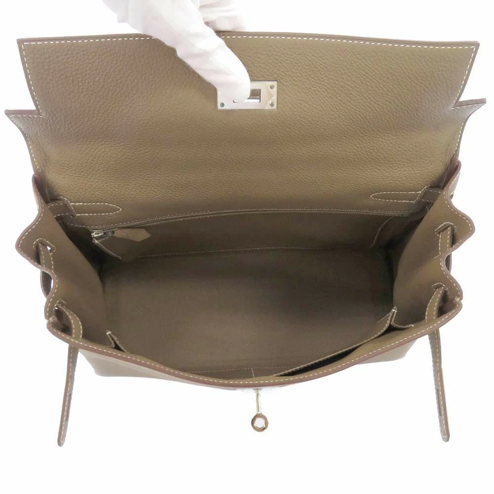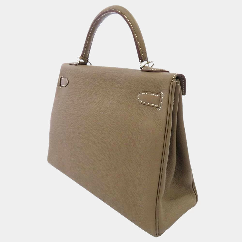 For an elevated everyday look, go for this chic Hermes Kelly bag. Crafted from Etoupe Togo leather, this stylish bag is characterized by a rolled top handle, palladium hardware, padlock, clochette, and detachable shoulder strap. This well-balanced bag has roomy interiors to hold all your belongings.