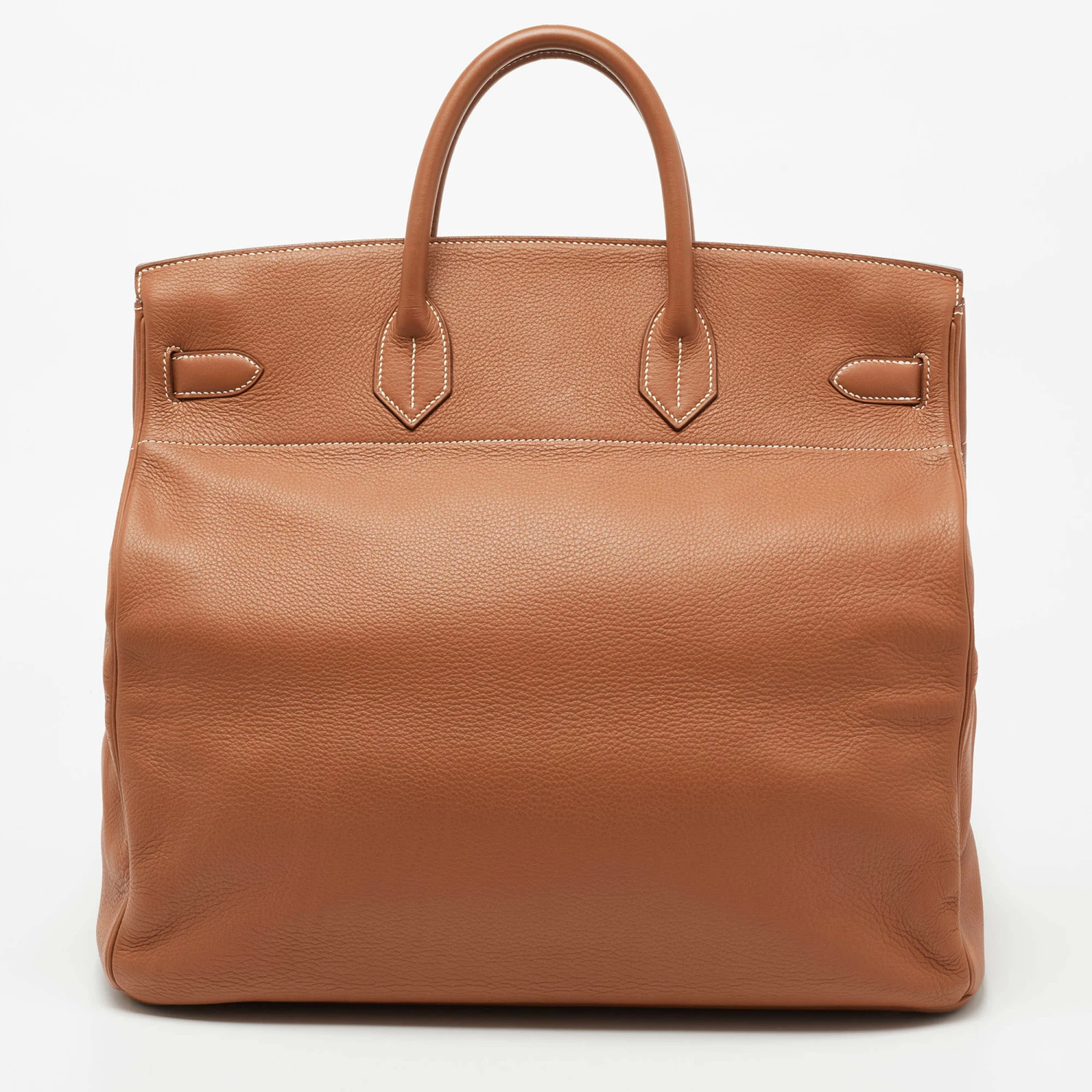 Timeless design coupled with rich craftsmanship, this Birkin HAC 45 bag is crafted from Etrusque Togo leather. Its foldover top is secured by a gold-finished lock, and the base is secured by studs. The interior of the bag has leather lining and enough space, making it ideal for traveling. Complete with dual-rolled handles, this bag is an investment that will last you for years.