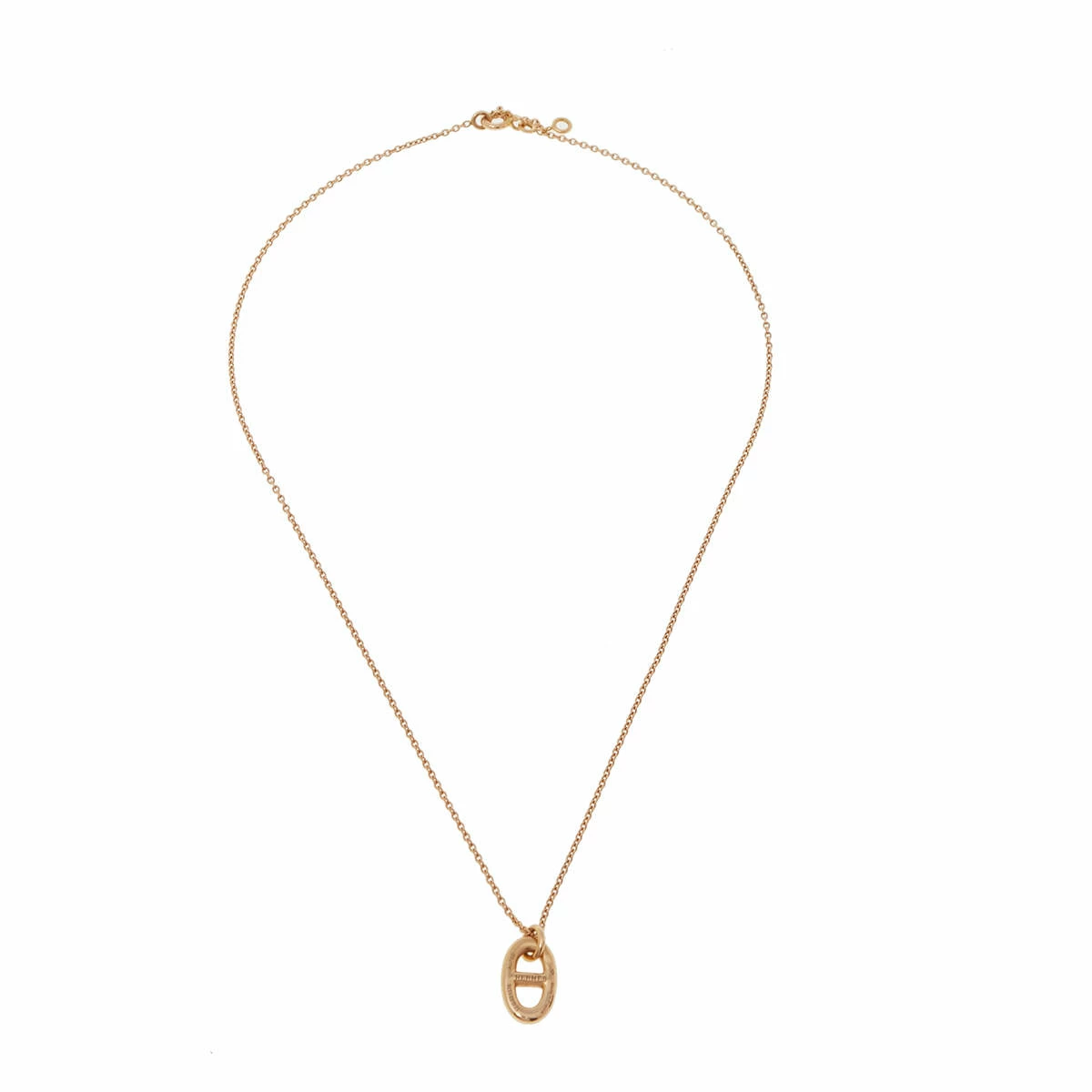 This Farandole necklace is from Hermes’ nautical-inspired ‘Chain d’Ancre collection.’ The collection was specifically designed to reflect the elegance of a boat’s chain-link line to its anchor. This necklace, crafted in 18k rose gold, features the signature motif as the pendant, elevated with signature engravings.