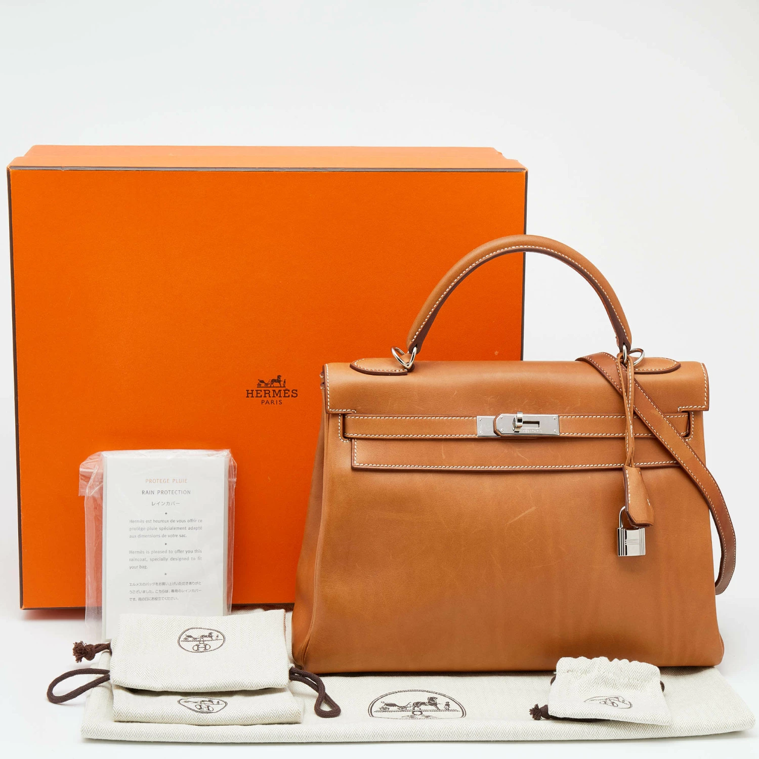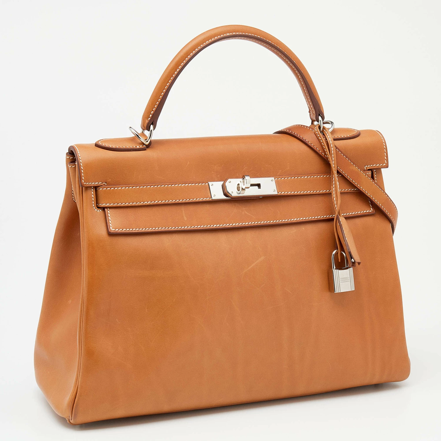The Hermes Kelly is beautiful as it is carefully hand-stitched to perfection. This Fauve Kelly Retourne 32 is crafted from Barenia leather and has palladium-plated hardware. The bag comes with a turn-lock closure, a single top rolled leather handle, and a padlock with its keys within a clochette. The leather-lined interior houses enough space to easily fit in all your daily necessities. Invest in this beauty today!