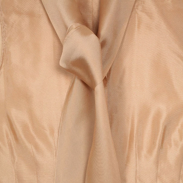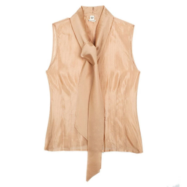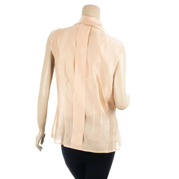Own this trendsetting top from Hermes today and. This sleeveless glossy peach top is detailed with a collar and features a tie in the front. The pleated front and back with bold fabric trim adds the finishing touches.