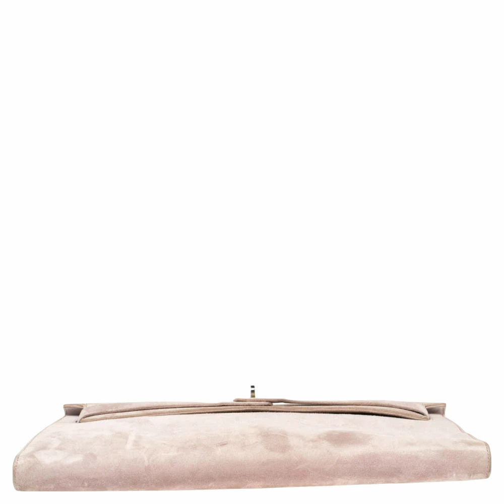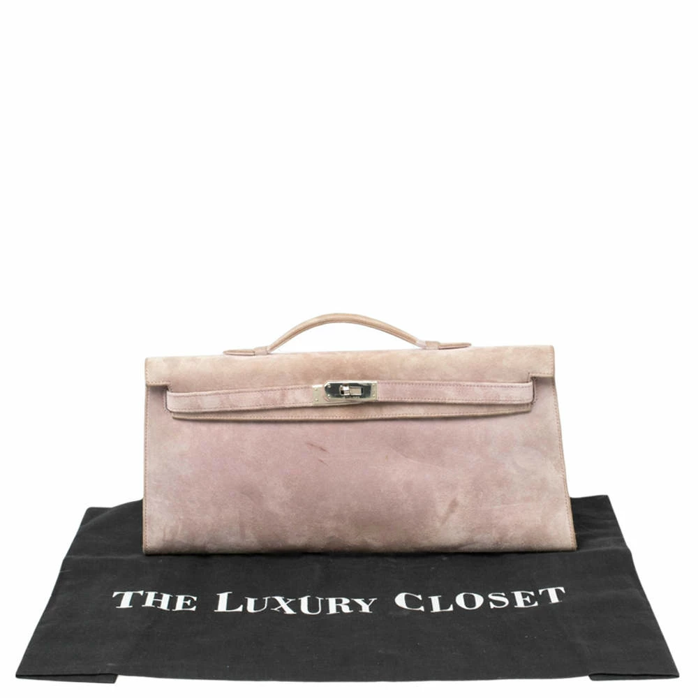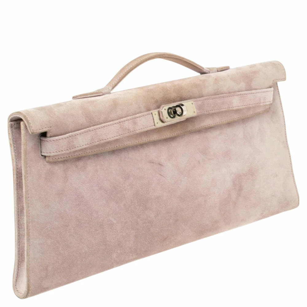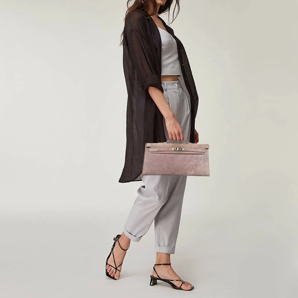 This Kelly clutch is carefully stitched to perfection. Crafted from suede, it has a slim silhouette that’s easy to carry. The clutch has palladium-finished hardware that forms the signature Kelly lock closure and a suede & leather-lined interior that will hold your essentials. This Hermes Kelly Longue clutch is a timeless accessory.