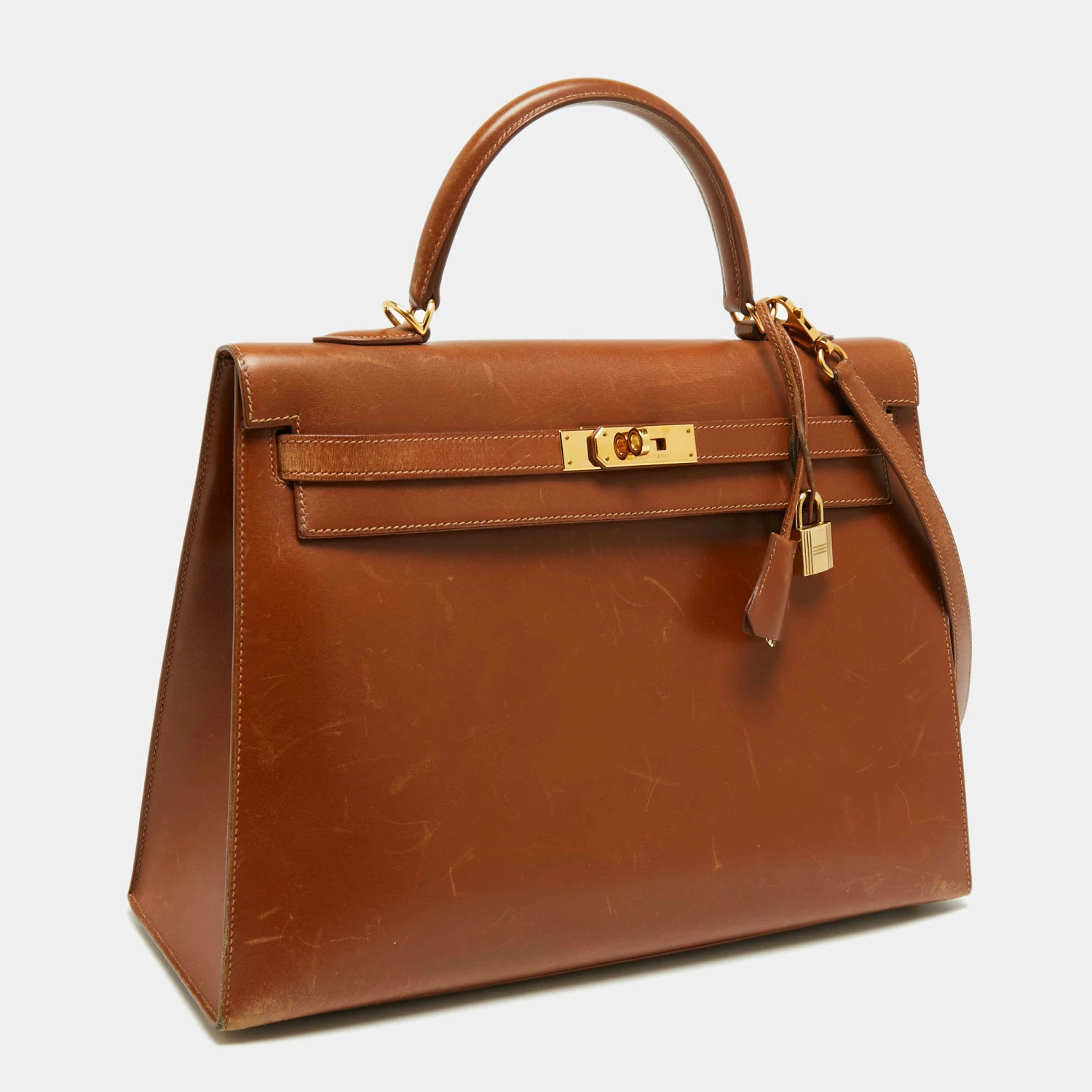 When it comes to beautiful bags, there are hardly any that can come close to the Hermès Kelly. It is a creation filled with beauty, utility, and value. We have here the Kelly Gold Sellier 35 in gold-finished hardware. Carefully hand-stitched to perfection, this Kelly Sellier in Box leather presents itself in an elegant hue that when paraded, all eyes will be nowhere else but on the bag. It is accompanied by the signature elements of the turn lock, top handle, and detachable shoulder strap. The bag will also fit all your daily necessities and still hold shape. An absolutely worthy investment that you can make today.