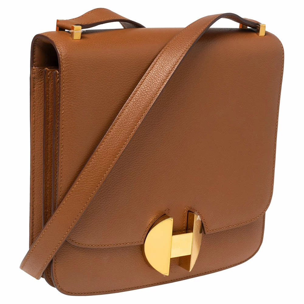 The Hermes 2002 – 20 bag shares a resemblance with the iconic Constance. Carrying a structured, boxy silhouette, the 2002 – 20 bag is highlighted by a clasp that is an H with rounded sides. With this eye-catching element, the brand revisits the Hermès 2002—a design from the archives. This version here is made of gold Evercolor leather and the hardware is gold-plated.