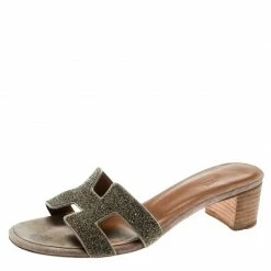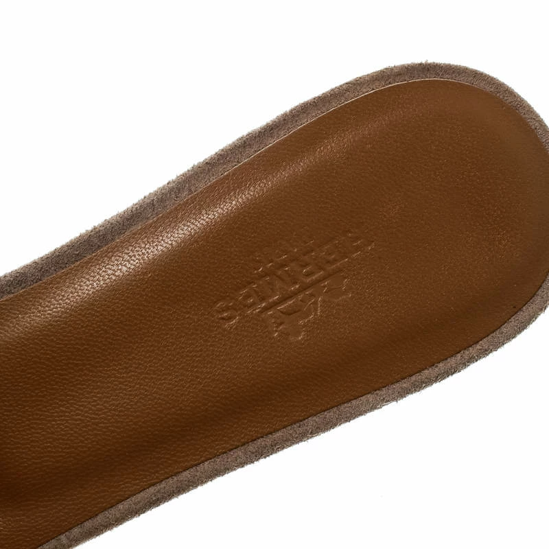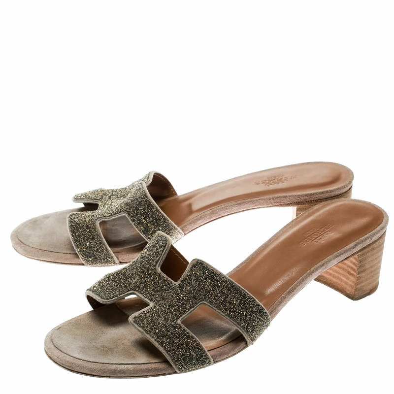Crafted in gold glitter leather, these Oasis slide sandals from Hermes are classy and comfortable with their wood-finished 4.5 cm block heels. These slides feature the signature H-shaped straps on the front. The insoles are lined with leather and suede and carry the brand labels.