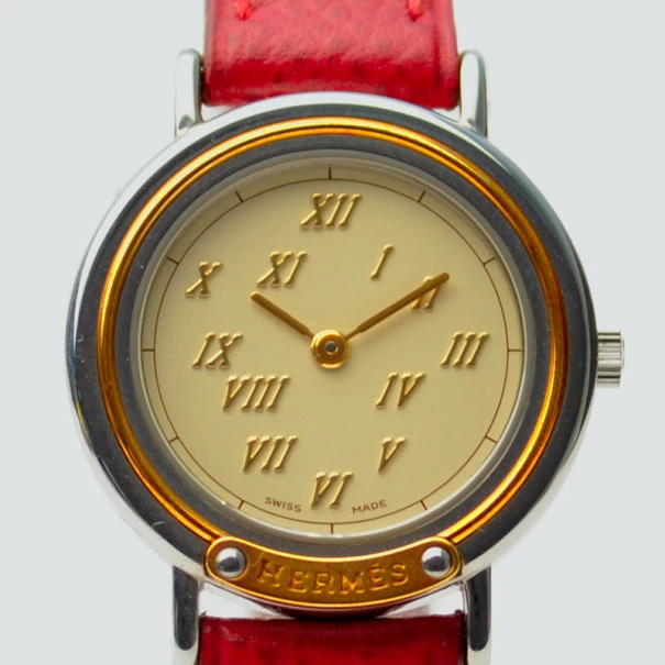 Fire up your outfit with this alluring Hermes Wristwatch! The round shaped crème dial hosts playfully arranged Roman numerals and gold hands. The dual toned bezel aligned with a stainless steel case flaunts the engraved Hermes brand name. The lugs are endowed with a snake embossed red leather strap stitched to an Ardillon style buckle in gold-tone. Be bold and beautiful as you carry this bright watch with pride.Gender: LadiesOriginal Retail Price: US $1,105Condition: NewCase Size: 25 MMBand Material: LeatherBand Size: 19 CMMovement: QuartzCase Material: Stainless SteelIncludes: The Luxury Closet Box