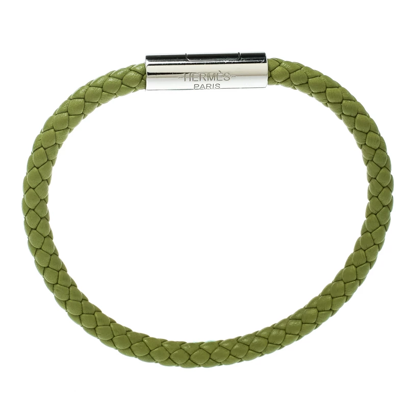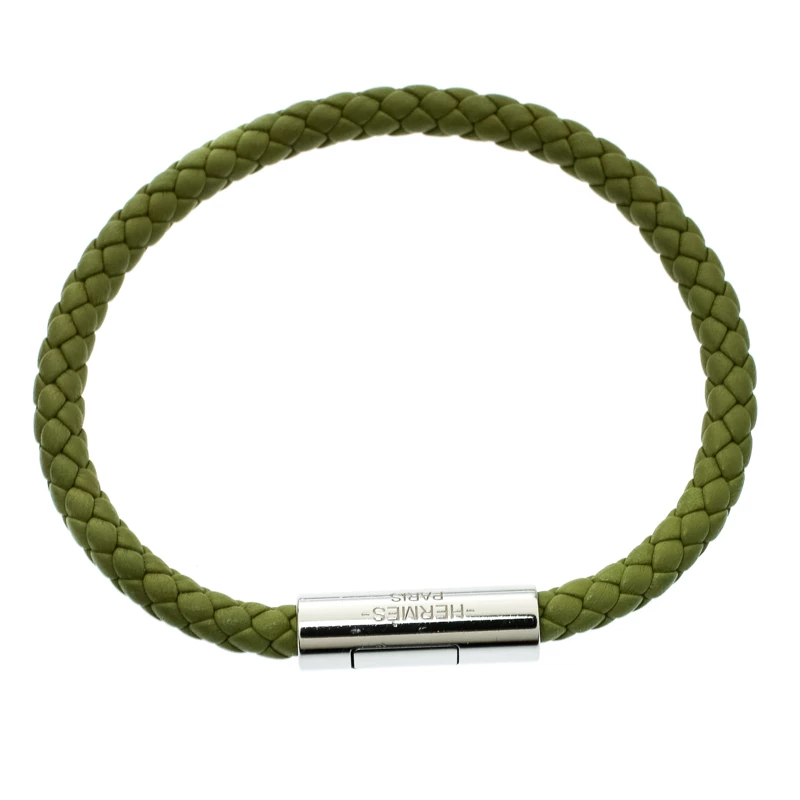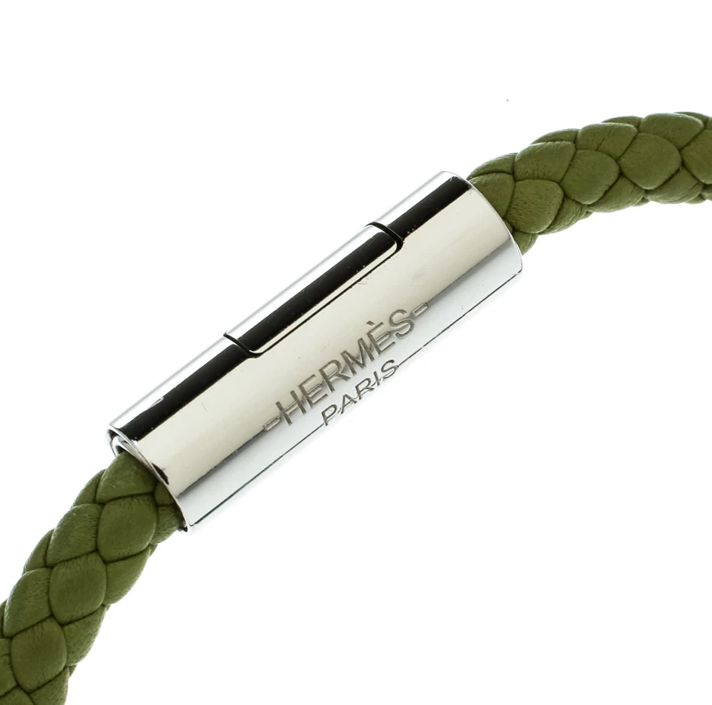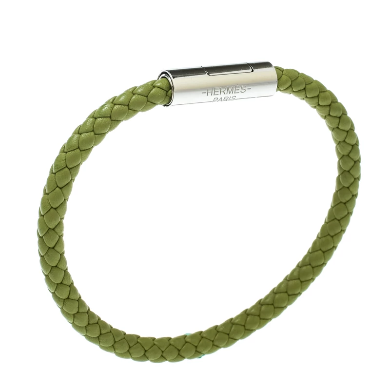 Simple yet sophisticated, this Goliath bracelet from the house of Hermes features a green braided leather body and topped with a palladium-plated metal motif with ‘Hermes’ lettering on it. Wear by stacking it with similar bands.