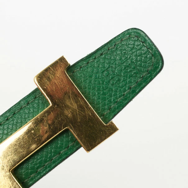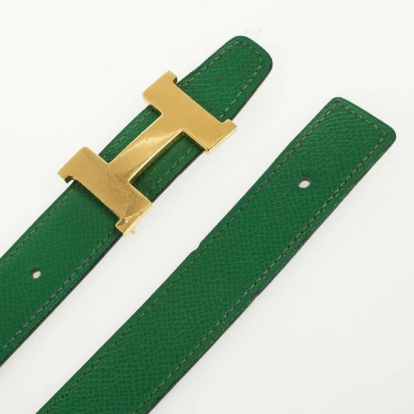 This Hermes Green Leather Reversible Constance Belt will add a chic touch to your outfit. It is crafted from smooth leather and features a signature H buckle. Wear this versatile belt on either side and stand out!Original Retail Price: US $1,205