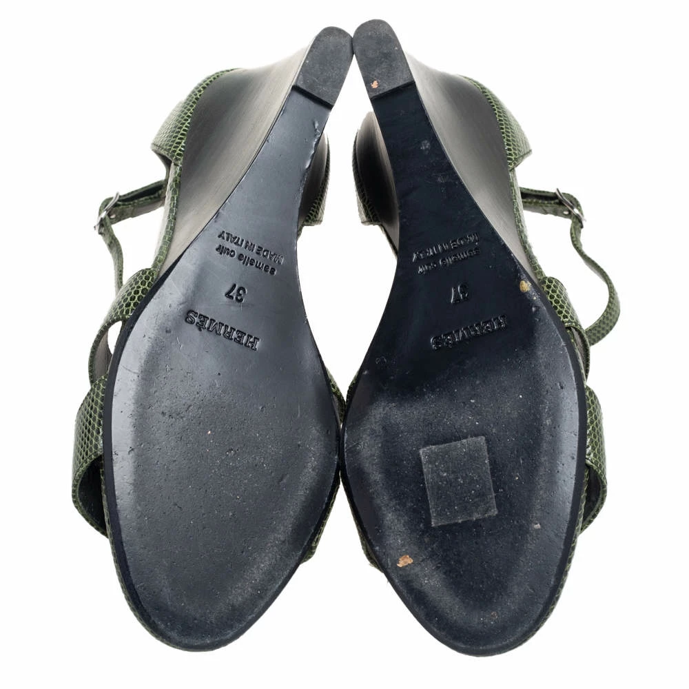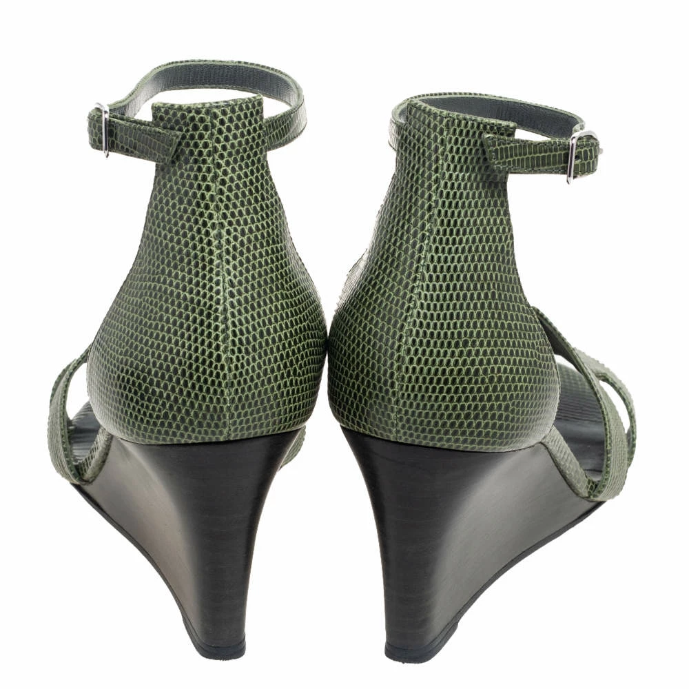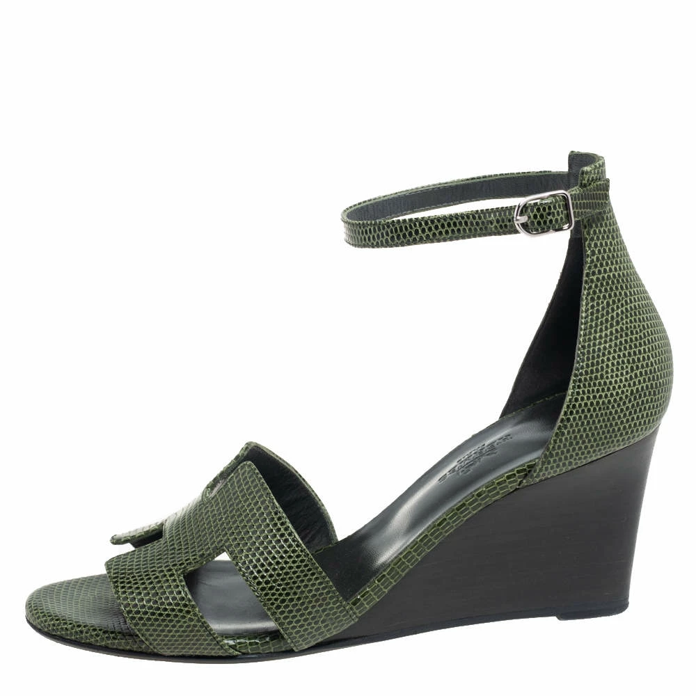 We have our hearts set on these sandals from Hermes. This green pair has been crafted using lizard leather and designed with the signature H on the vamps. They also feature ankle buckle closure and 8 cm wedge heels. Take this number out and enjoy both comfort and style.