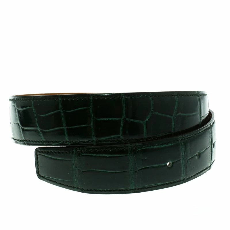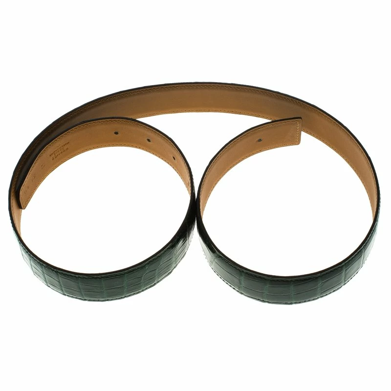 A classic add-on to your collection of belts, this Hermes Green Porosus Crocodile Leather Belt Strap has been crafted from exotic leather in France. It has an eye-catching green-colored exterior that will complement any buckle shape. This sleek piece carries an edgy style, making it a wardrobe essential.