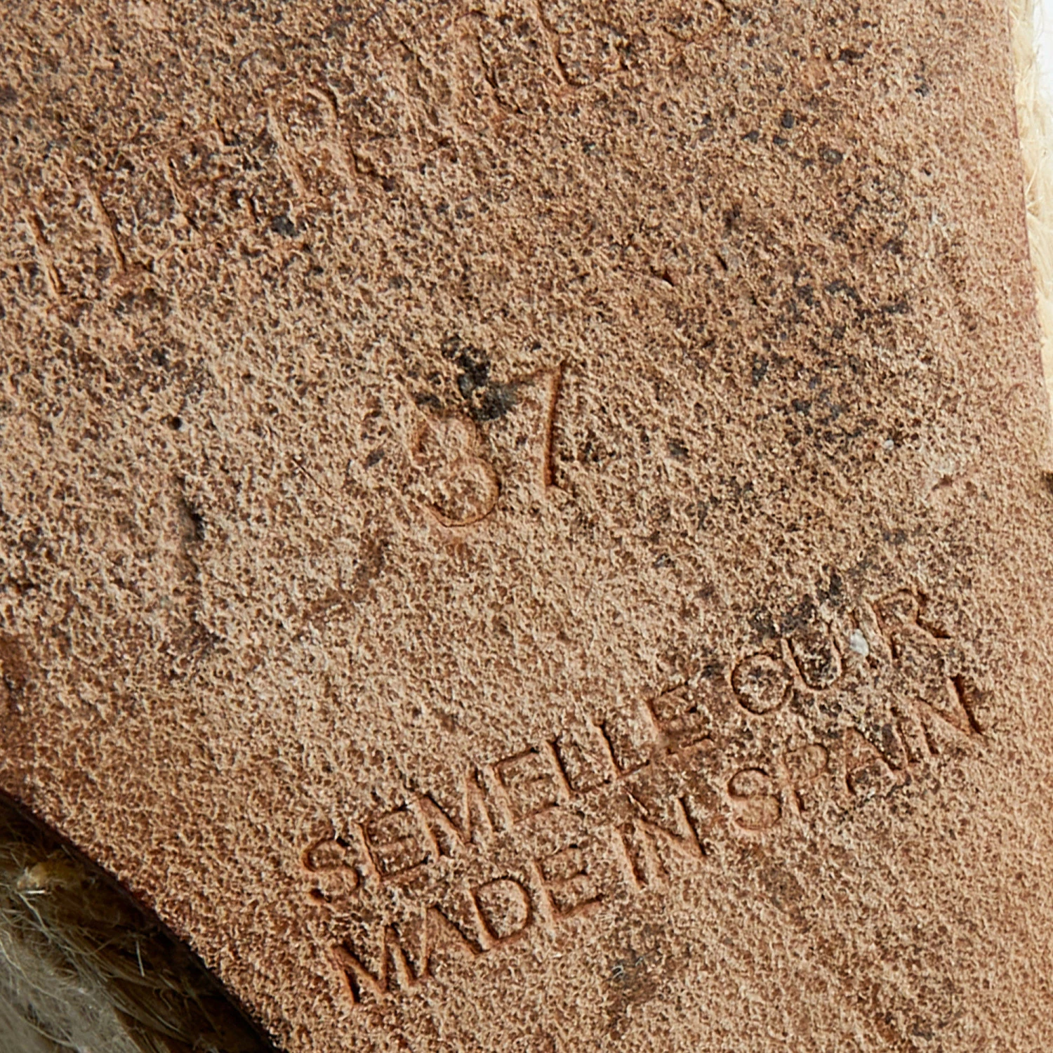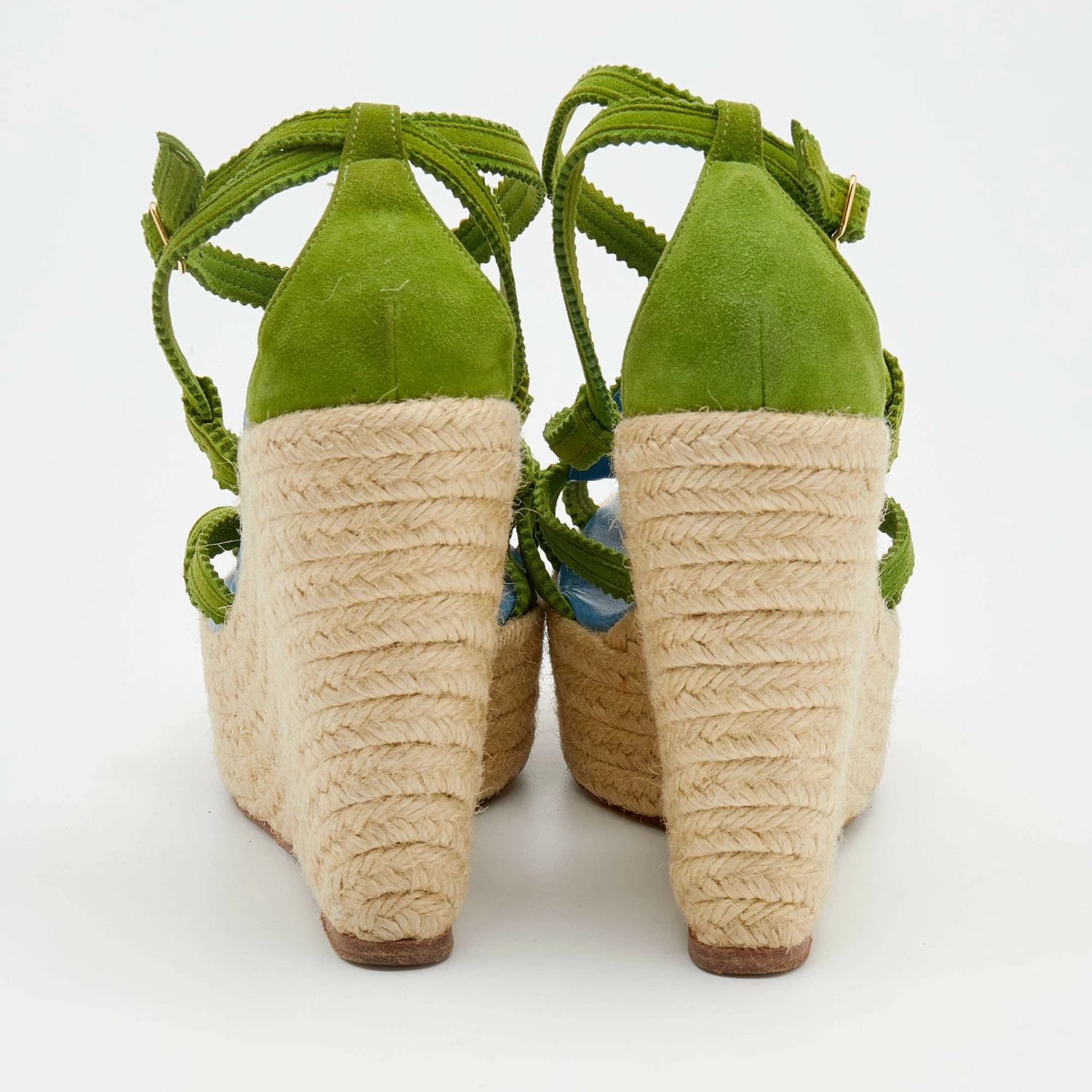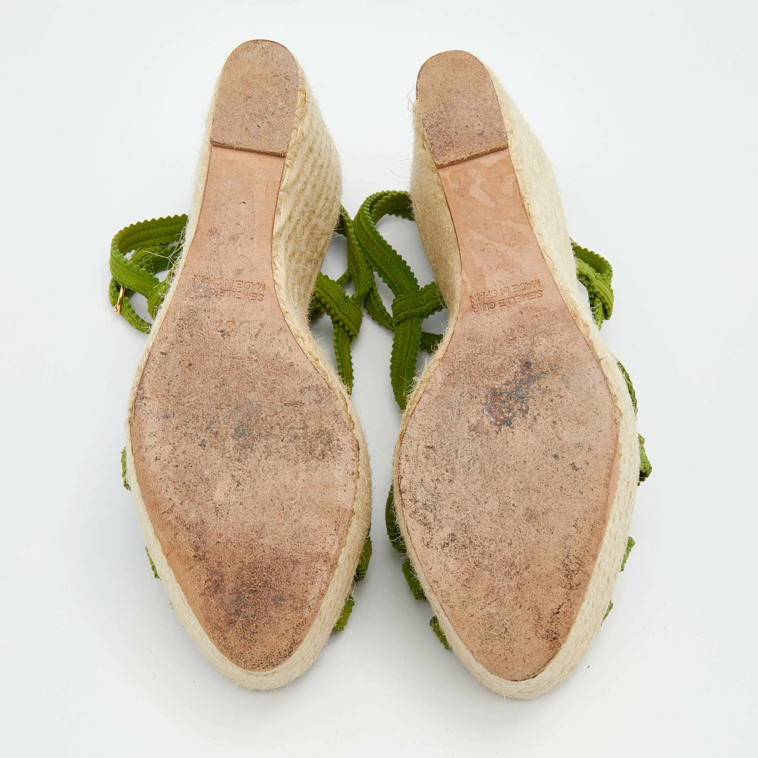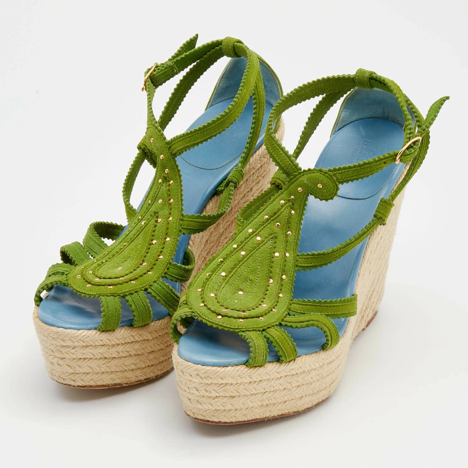 Comfort and style go hand in hand with these splendid sandals from Hermes. The green sandals are crafted from suede and feature rounded toes with an artistic strappy detailing on the vamps. They feature comfortable insoles, buckled ankle closures, and 12.5 cm espadrille wedge heels. Pair them with breezy dresses for your casual outings.