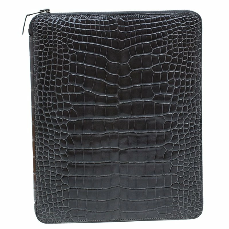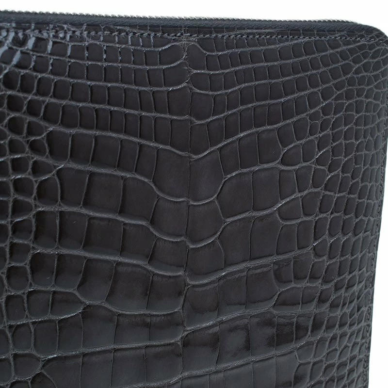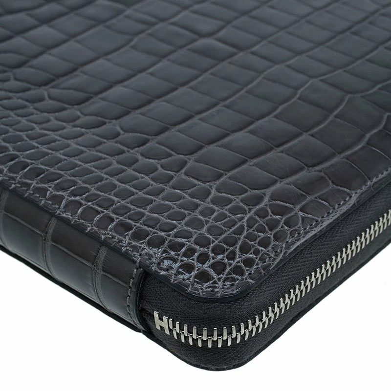 This light weight agenda cover by Hermes is crafted from Exotic black crocodile embossed leather. It comes with a zip around closure and is functional and handy with all its features. Organize your events in this fancy unique piece.