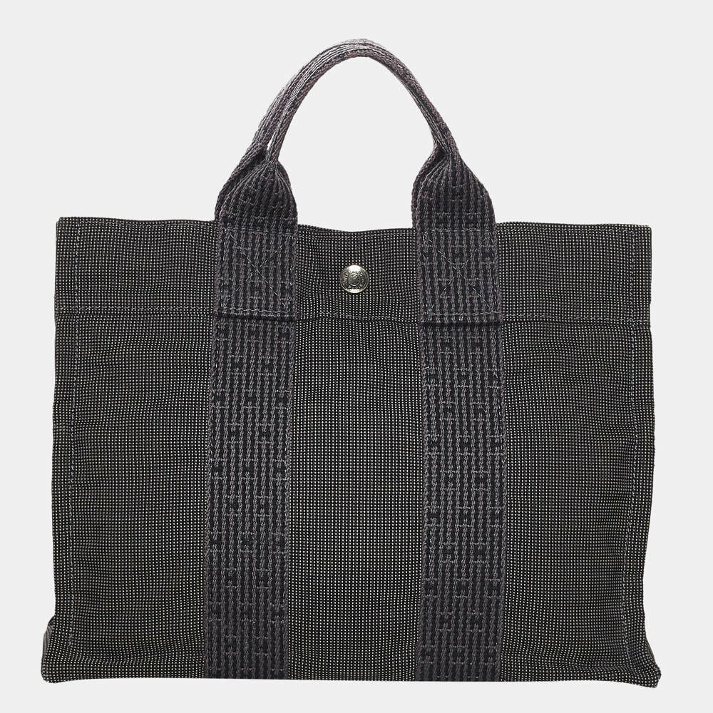 The Fourre Tout PM features a canvas body, flat handles, an open top with a snap closure, and an interior zip compartment.