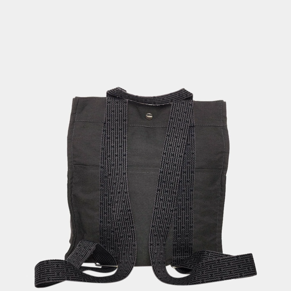 This backpack features a canvas body, flat back straps, a flat top handle, an open top with snap button closure, and an interior slip pocket.