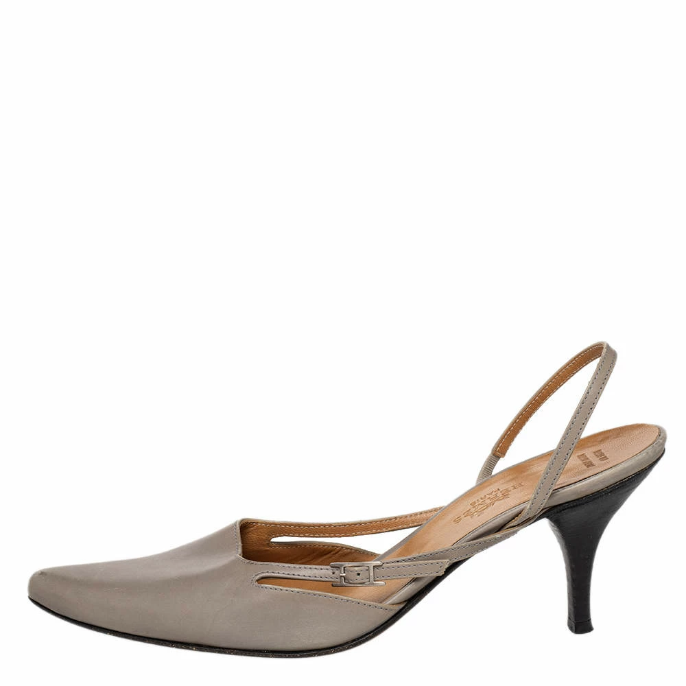 Be a trendsetter by waltzing out in this exquisite Hermes pair. Crafted from leather, these fabulous grey beauties feature pointed toes, high heels, and slingbacks. Slip them on over simple outfits and let these sandals have the spotlight.
