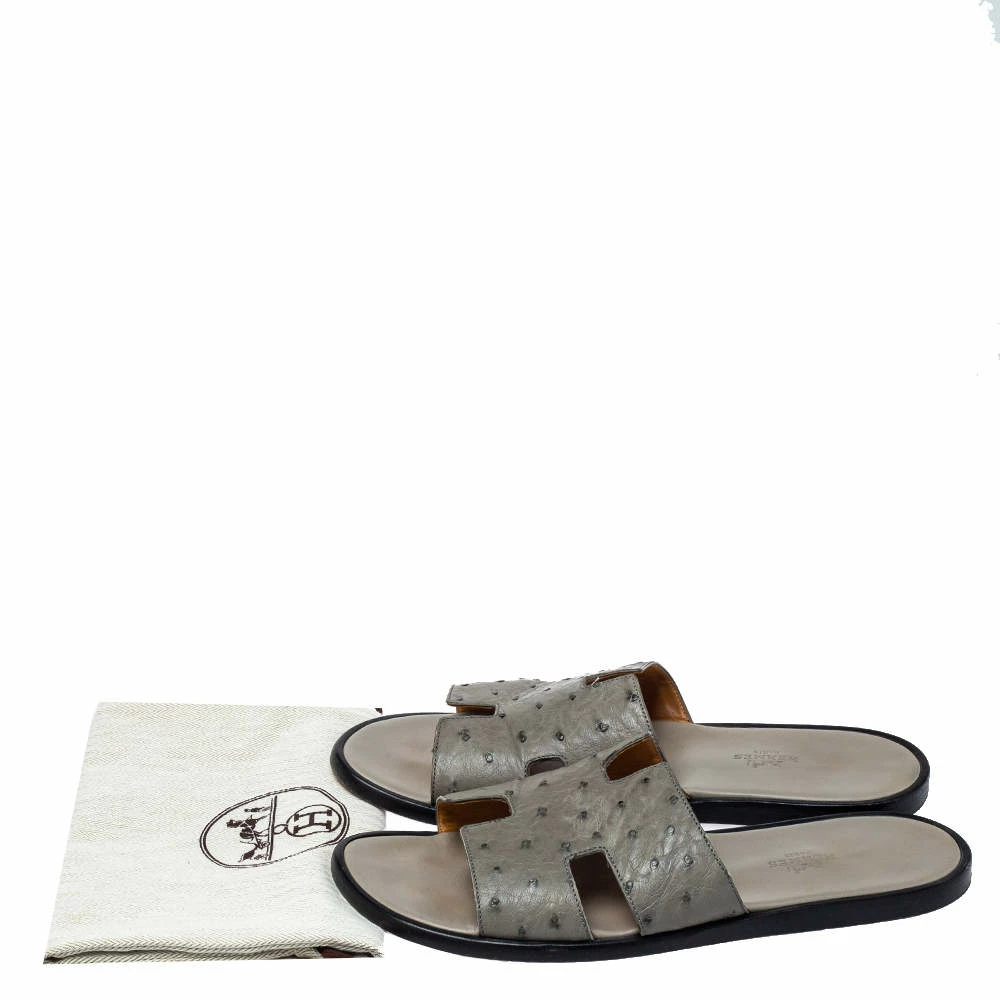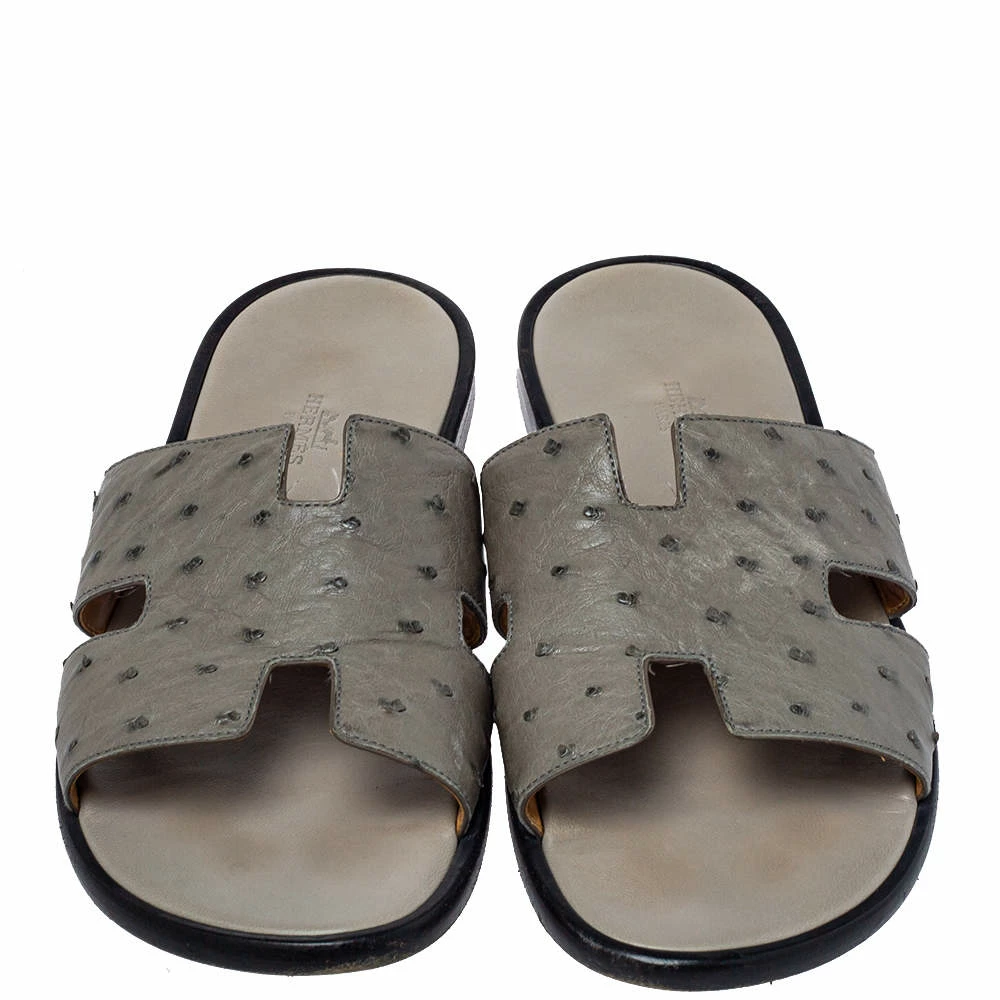 Put your best foot forward this season in these Hermes men’s sandals. These grey Izmir sandals have been crafted from ostrich leather in Italy and they feature the iconic H on the vamps as well as insoles meant to provide comfort at every step. NOTE: FOR UAE CUSTOMERS ONLY