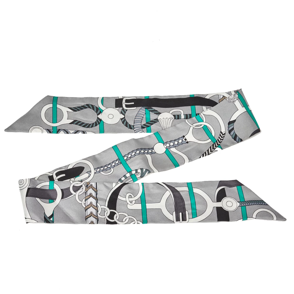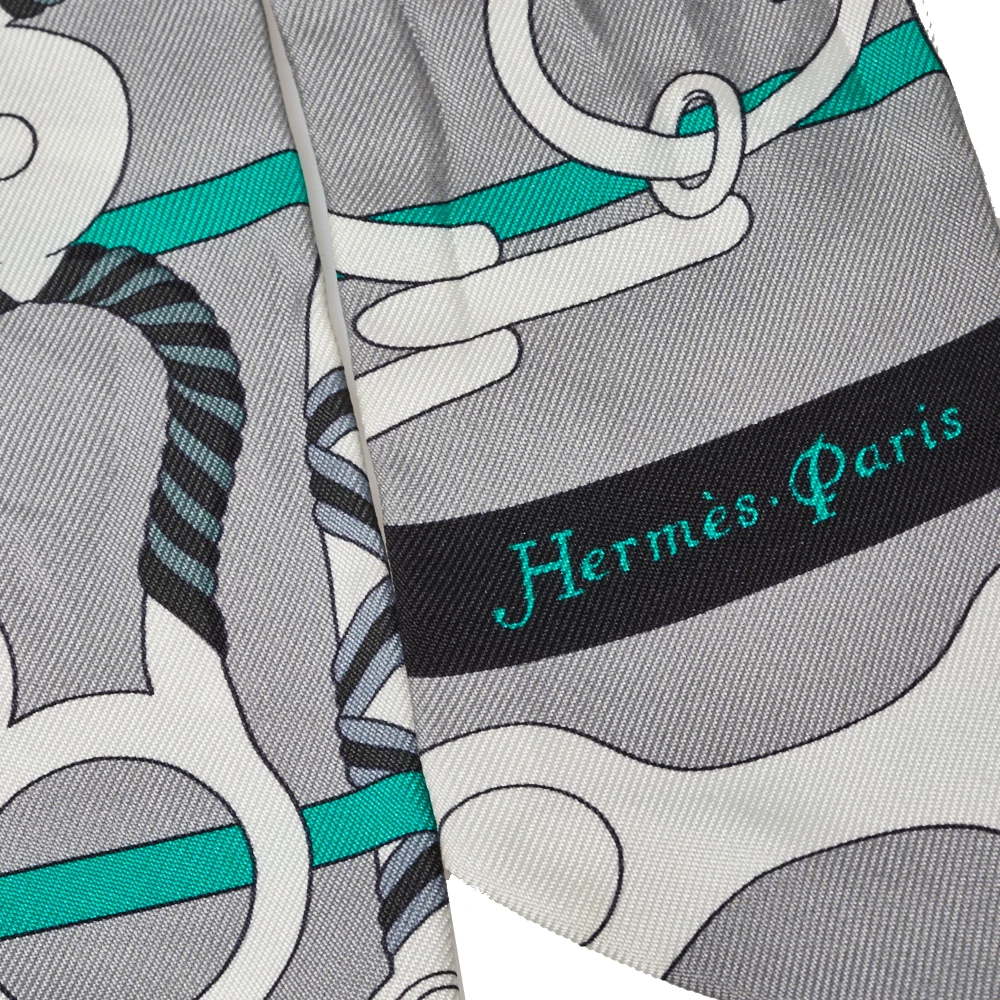 This fabulous Twilly scarf by Hermès complements almost all your outfits and looks pretty whether you tie it around your hair or your wrist. Cut from silk, this scarf is adorned all over with an interesting print and a classic grey background