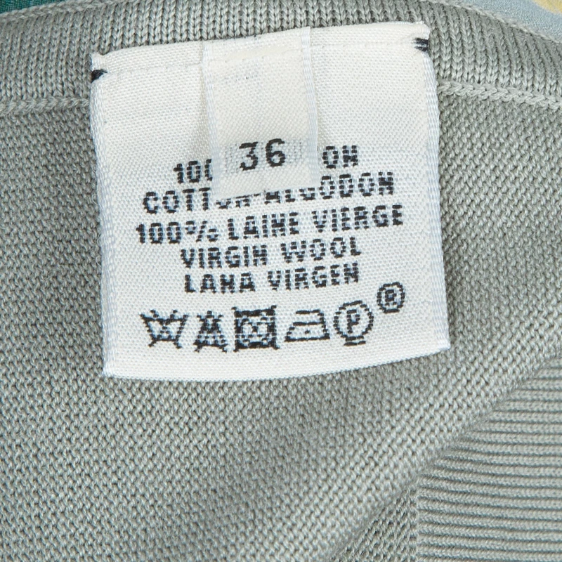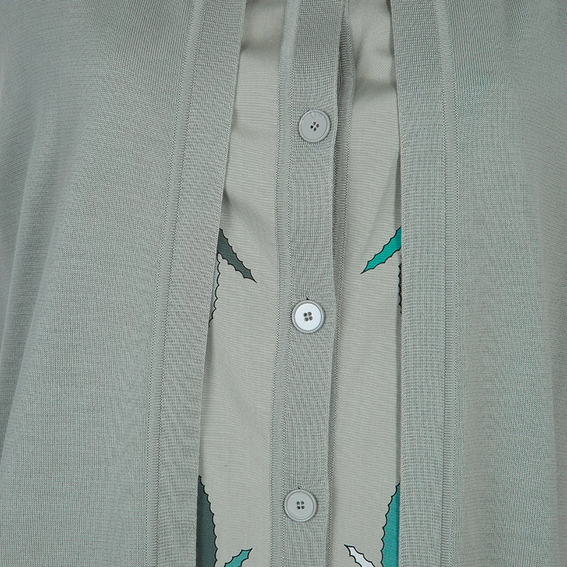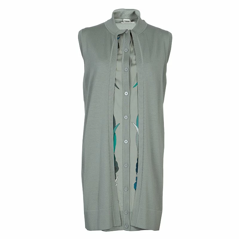Wardrobe this beautiful and stylish cardigan dress tailored by Hermes. It is crafted from cotton and wool blend, featuring adorable print and stand collars. This dress is accented with button closures and a sleeveless design.