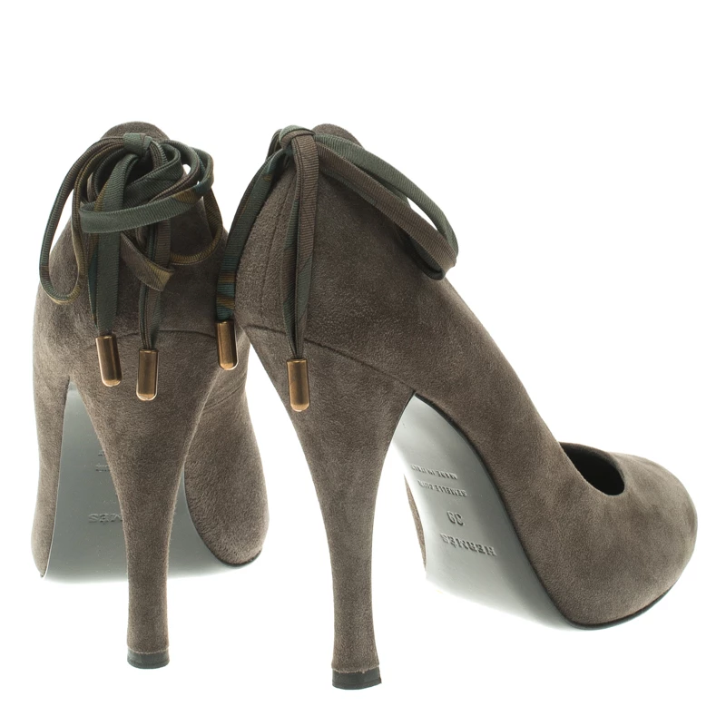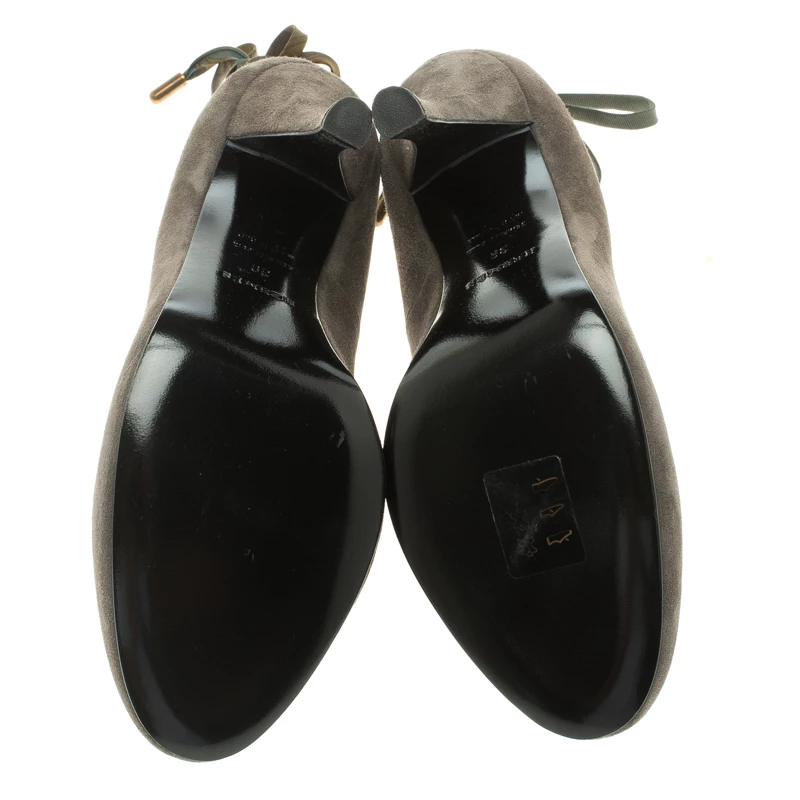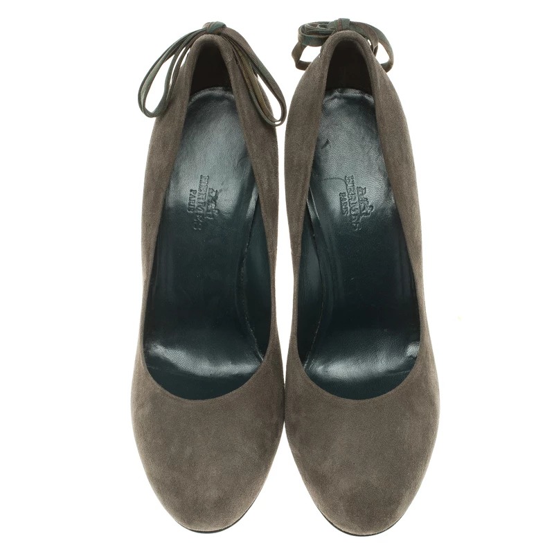 Complete all your classy ensembles with these enchanting grey pumps from Hermes. They carry a lovely exterior made from suede and styled with bows on the rears. The insoles are leather lined and decorated with the brand label while they stand tall on 12 cm heels.