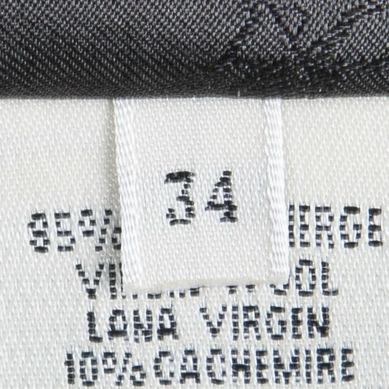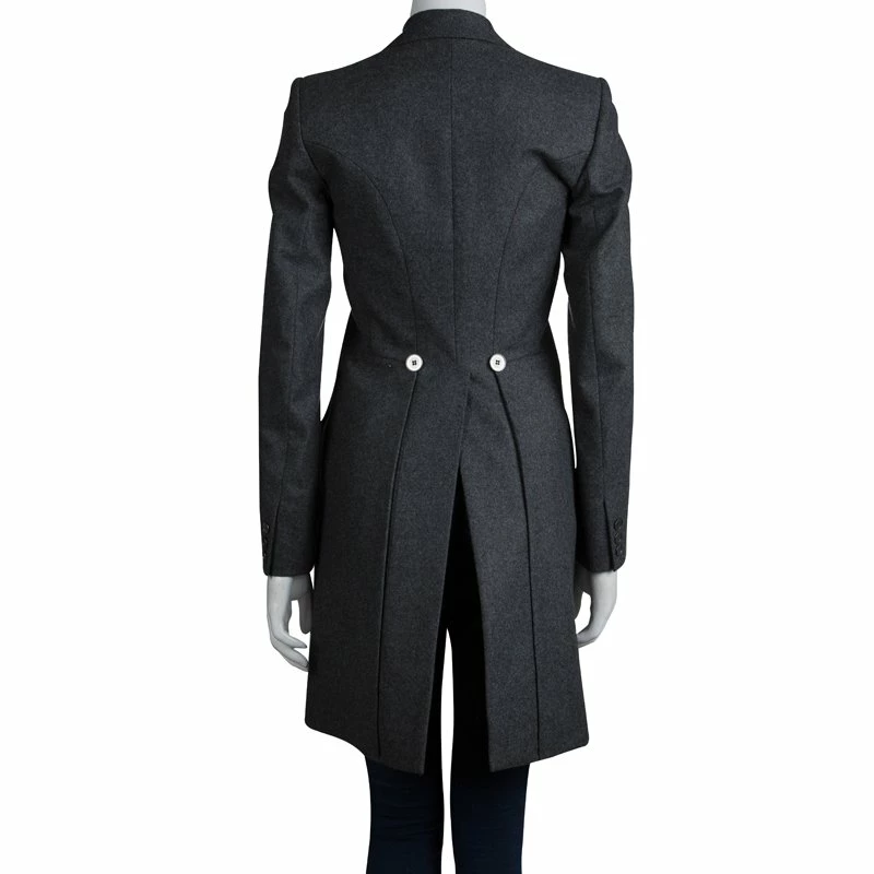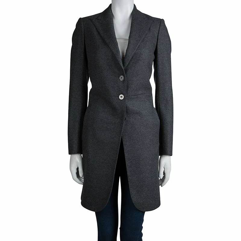 Treat yourself with this luxurious overcoat from the house of Hermes. Cut fromversatile grey wool, this overcoat features a fitted silhouette with pointed lapels and three front button closure. It comes with a darted rear with a slit that gives it the perfect fit. Wear yours with formal dresses and tailored trousers alike. Complete the look with ankle boots.