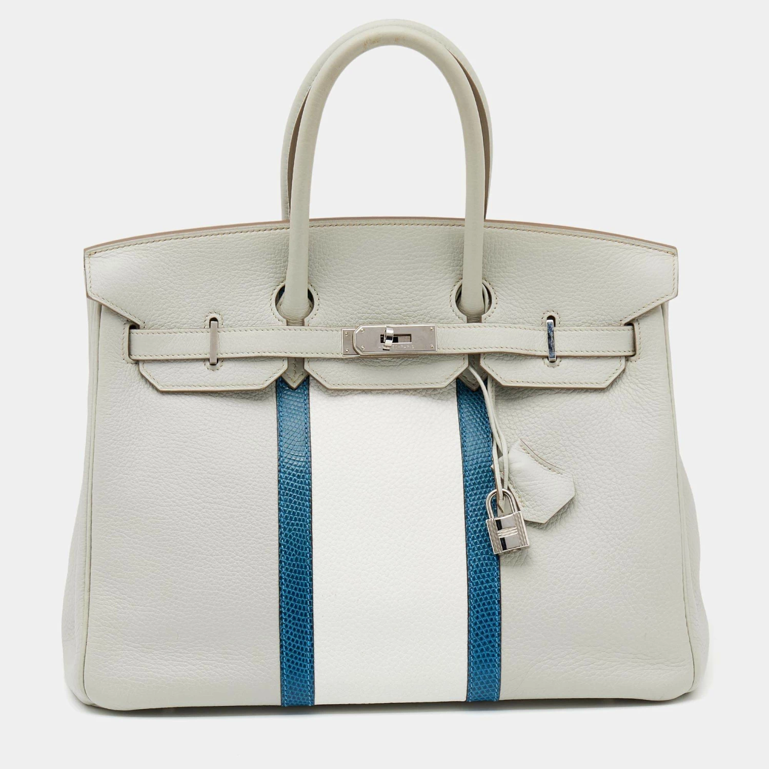 When it comes to beautiful bags, there are hardly any that can come close to the Hermès Birkin. It is a creation filled with beauty, utility, and value. We have here the Birkin 35 in palladium-finished hardware. Carefully sewn to perfection, this pre-owned authentic Birkin presents itself in Clemence leather with lizard trims highlighting the front. It is accompanied by the signature elements of the turn lock, padlock with key, top handles, and metal feet. The bag will also fit in all your daily necessities and still hold shape. An absolutely worthy investment that you can make today and cherish forever!