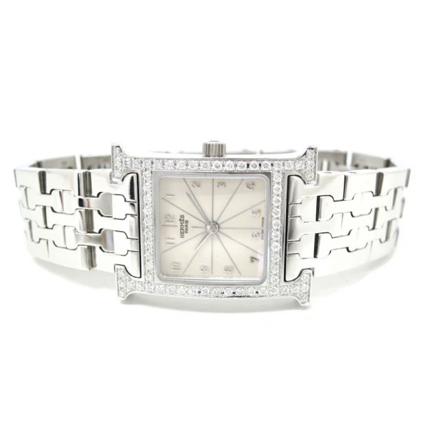 This Hermes H Diamond SS White Ladies Wristwatch reflects the skilled hands of the luxury house. The white dial features luminescent Arabic numerals and stick hands. The signature style Hermes diamond embellished bezel is encased in stainless steel case. The H link strap fits on the wrist with a deployment clasp closure. This 220g water resistant timepiece is durable and comfortable enough to be used for your daily outings.Original Retail Price: US $8,070Gender: WomensCondition: Gently Used (This watch has minor scratches on the bracelet. It has been polished, tested for water resistance and furnished with a new battery)Case Size: 22 MMBand Material: Stainless SteelBand Size: 14.5 CMMovement: QuartzCase Material: Stainless SteelBezel: Diamond, Stainless SteelIncludes: The Luxury Closet Watch Box