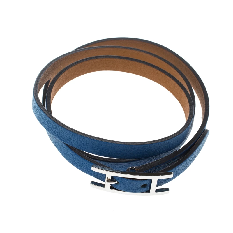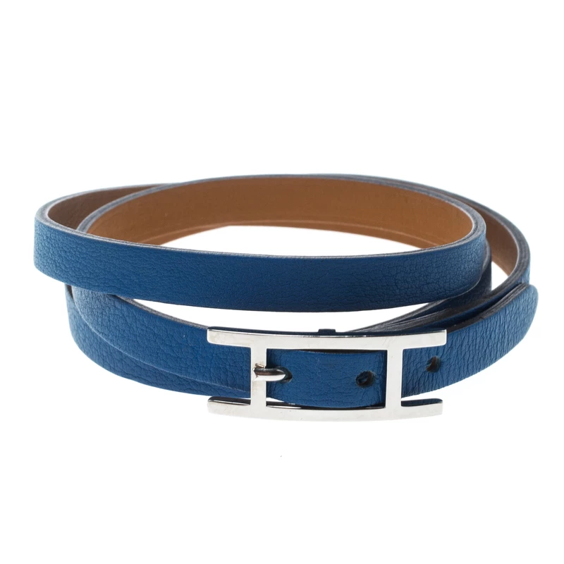 Featuring a palladium-plated buckle sculpted in the shape of the iconic ‘H’, this slim wrap-around Hapi 3 bracelet from Hermes is crafted from blue leather and is stamped with an embossed logo. It is a chic accessory that can be paired with everything, from causals to evening outfits.