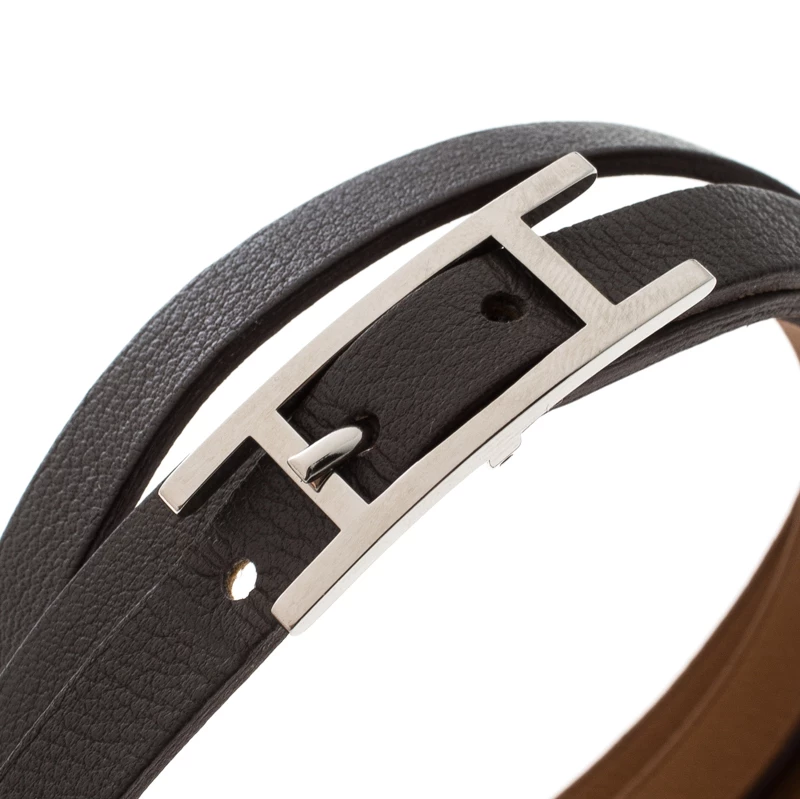 This Hermes Hapi 3 wrap bracelet is a chic accessory that can be paired with everything, from casuals to evening outfits. Made from leather in a grey shade, it is beautified with a silver-plated buckle sculpted in the shape of the iconic ‘H’. The bracelet has a long strap that effortlessly wraps around your wrist.