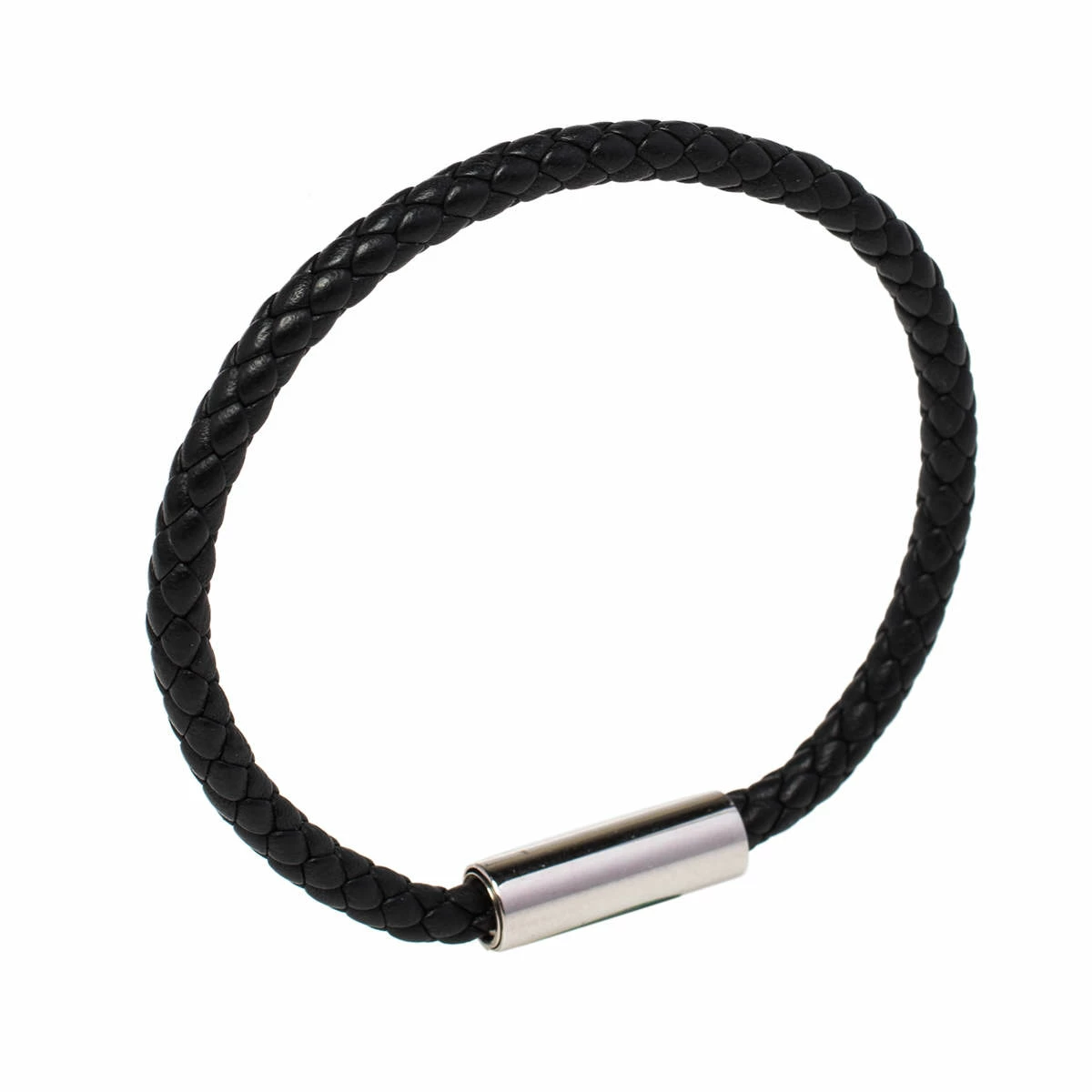 Simple yet sophisticated, this Goliath bracelet from the house of Hermes features a classic black-hued braided leather body and is topped with a palladium-plated metal motif with ‘Hermes’ lettering on it. Wear it by stacking it with similar bands.