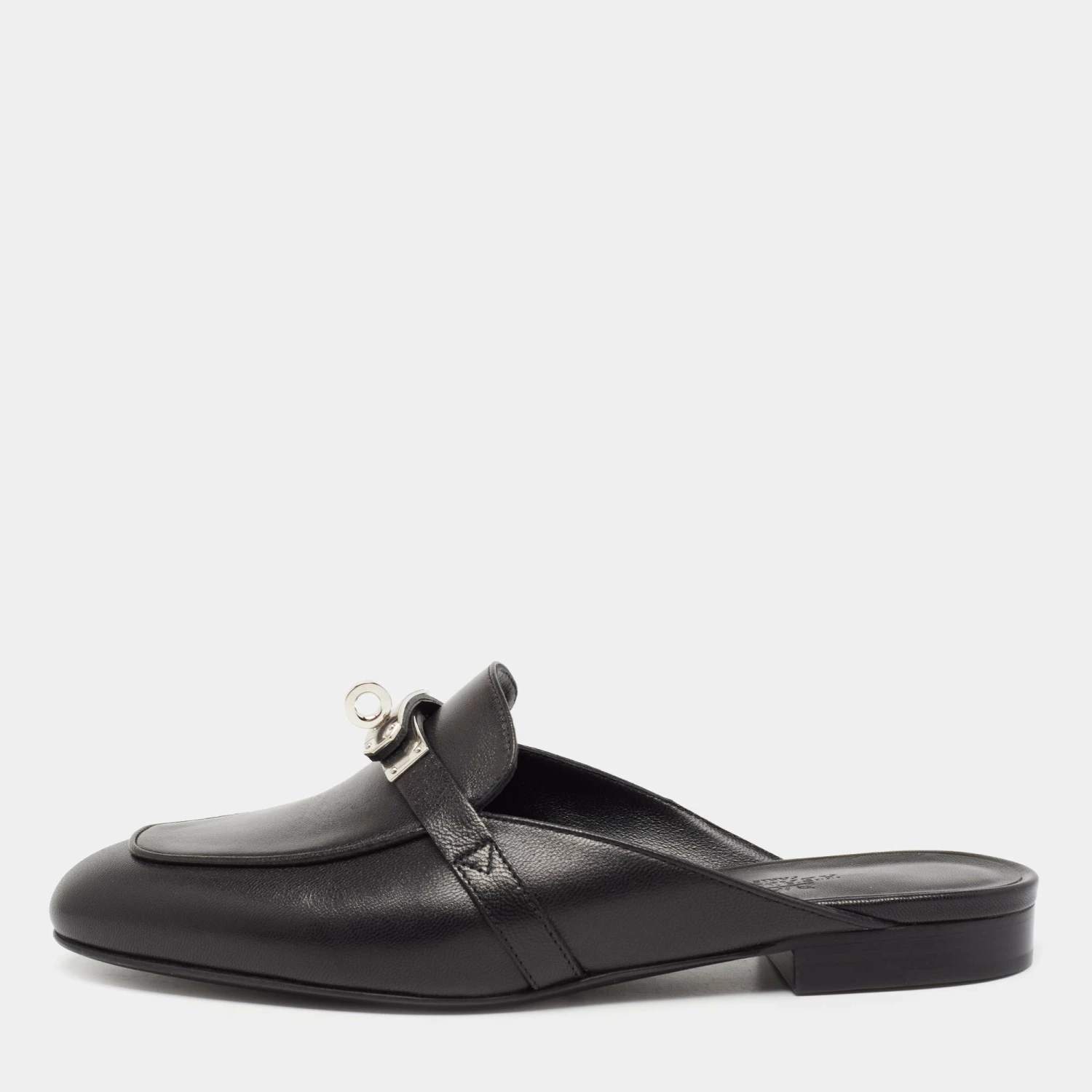 Designed in a loafer style, these Oz mules are from the house of Hermès. They are beautifully crafted in black-hued leather with the signature twist-lock in palladium-plated metal on the vamps. Slip these flat mules on for a comfortable style.