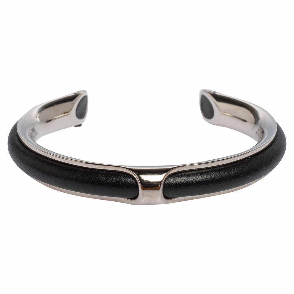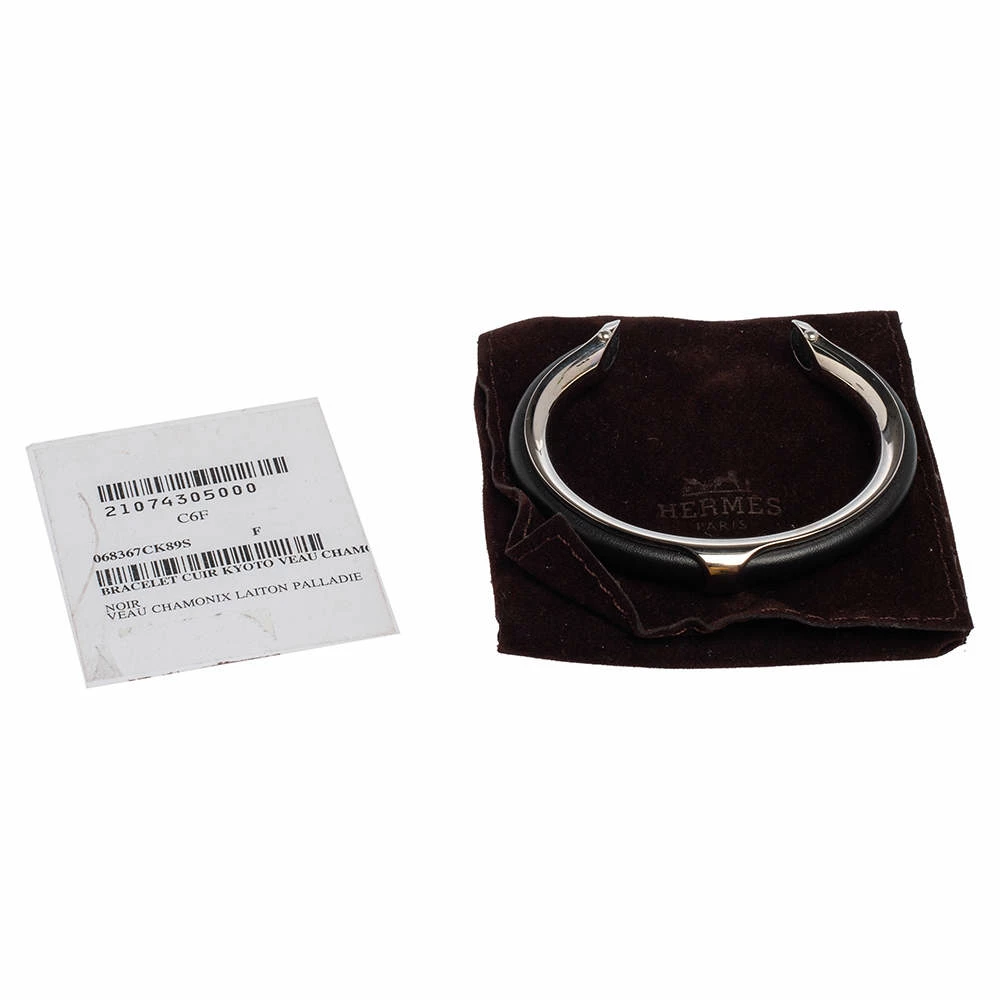Simplicity and class combine to form this exquisite Hermes Kyoto bracelet just for you. It is made from palladium-plated metal and black leather in an open cuff style. It will make a fine statement accessory.