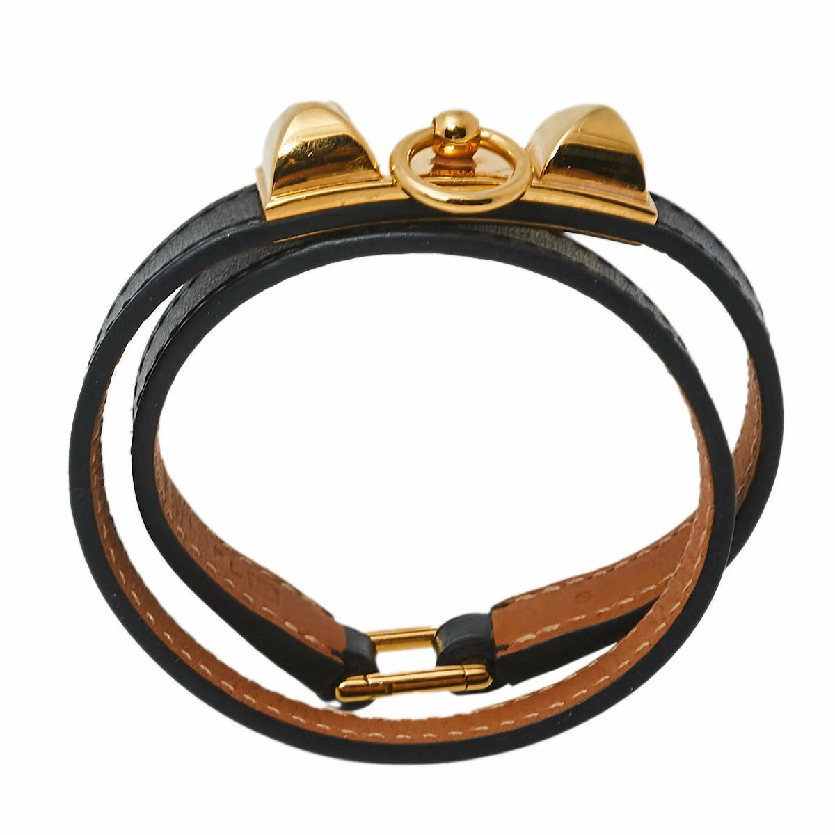 Designed in leather, this Rivale bracelet is a loved design from the house of Hermes. This bracelet is accented with gold-plated studs and ring for the signature Hermes look. It is a versatile creation that you can wear with casuals.