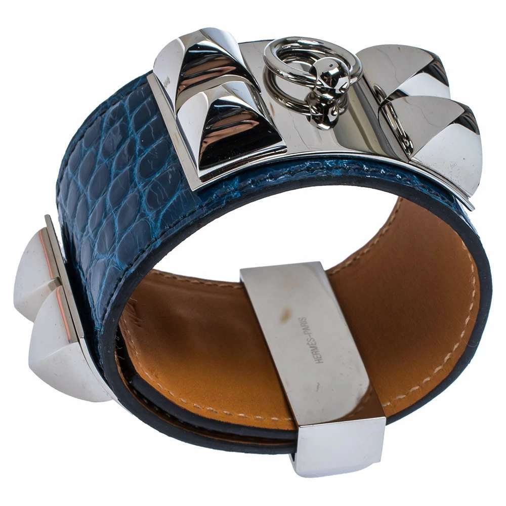 Exuding a downtown, punk vibe, this instantly recognizable bracelet is from the signature Collier de Chien collection of Hermès. The blue bracelet, made of alligator leather, is adorned with the iconic Collier de Chien motif in palladium plated metal featuring pyramid studs and a ring. It is completed with an intricately crafted turn-lock closure. This bold creation is a testimonial to the dog collar made by the label in 1923, paving ways for various design iterations. NOTE: (Available for UAE Customers Only).
