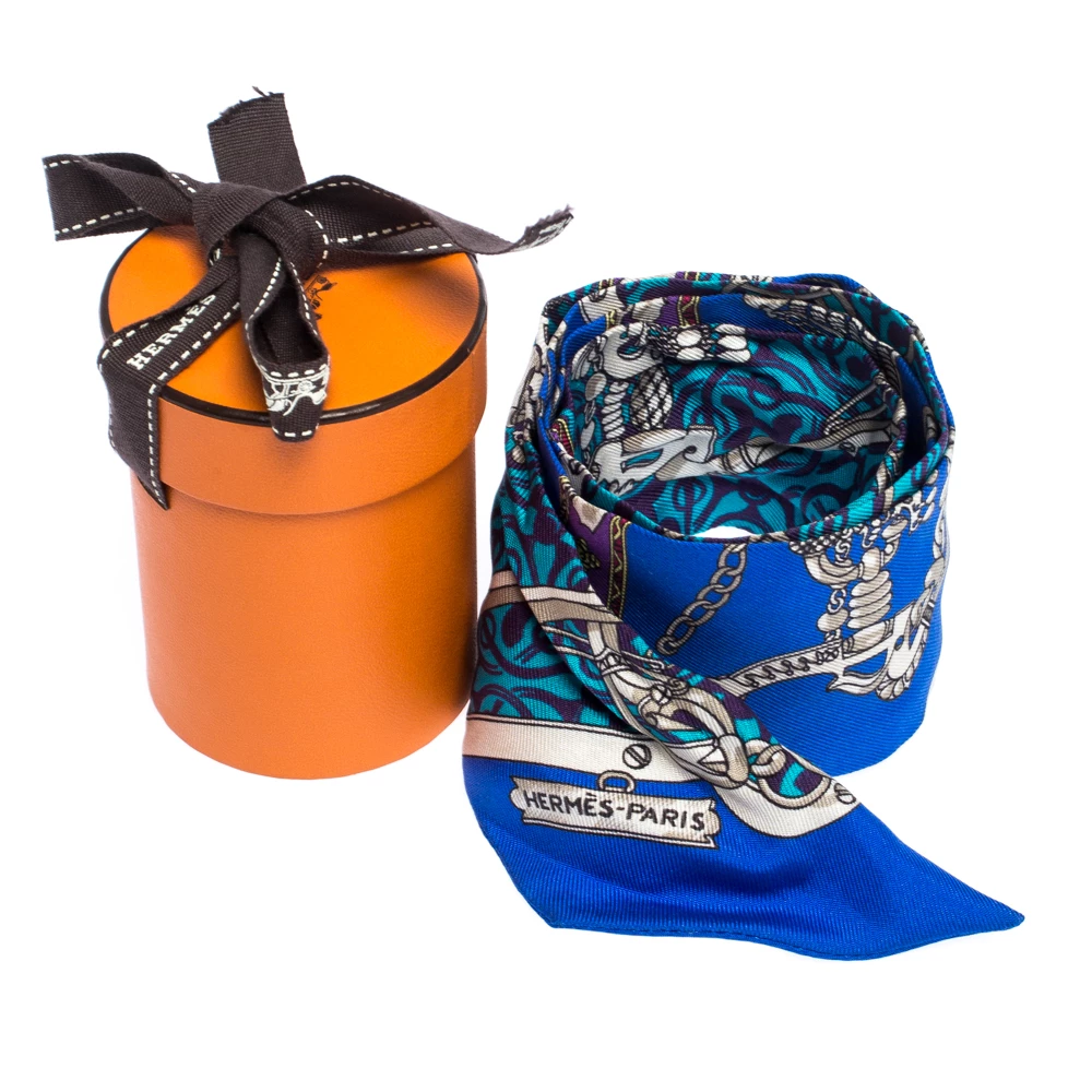 To be tied around your wrist, head, or handbags, twilly scarves are versatile accessories to own. The Twilly scarves by Hermes bring unique designs on fabrics that are smooth and luxurious to touch. This silk one here is beautifully blooming with equestrian prints and colours.