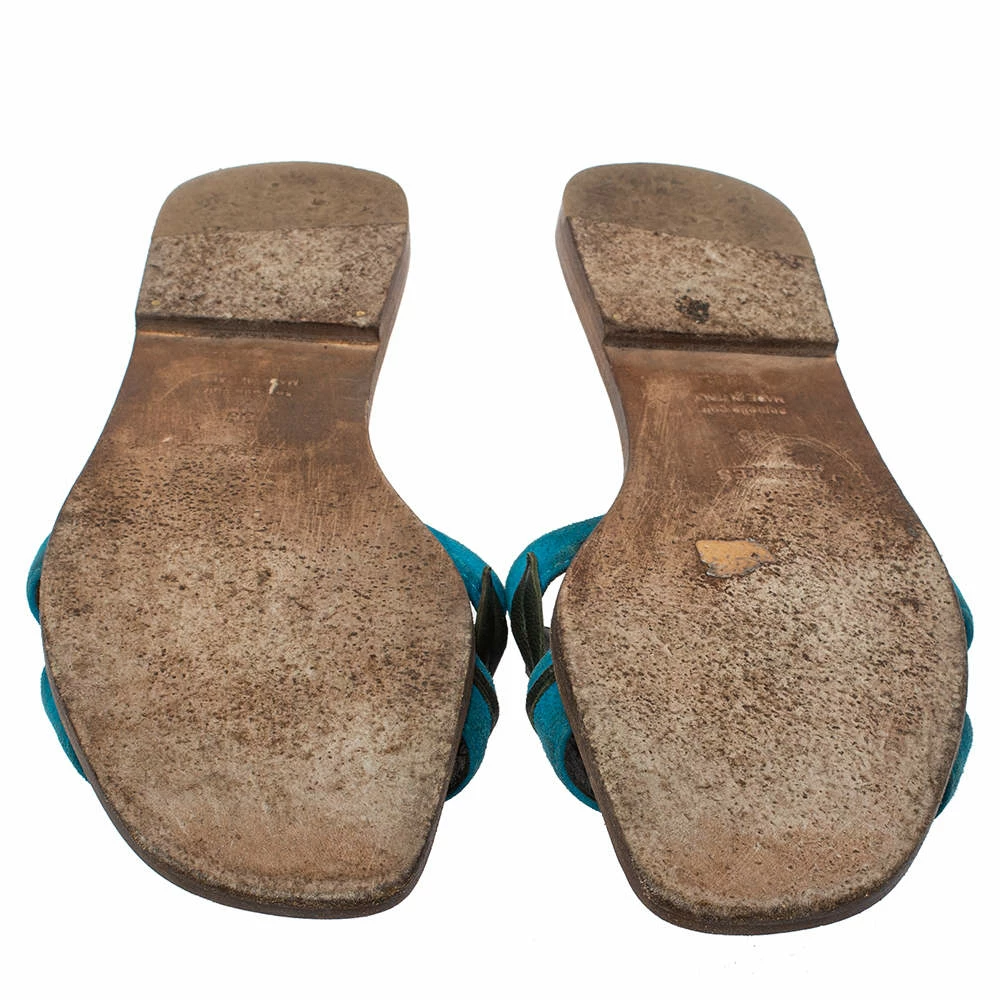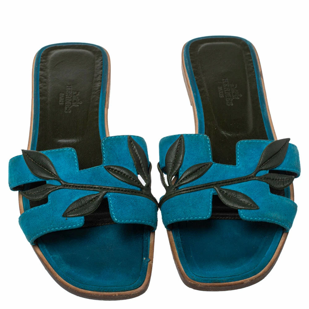 The famous Oran sandals by Hermès gets a gorgeous update in this blue pair. The slides come crafted from leather, and on the iconic H cut on the vamps, pretty leaves are added as an enhancement. Leather insoles and outsoles complete the pair.