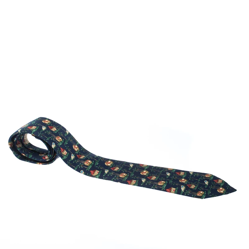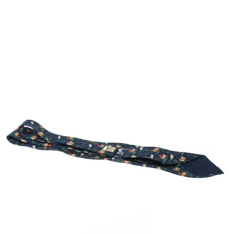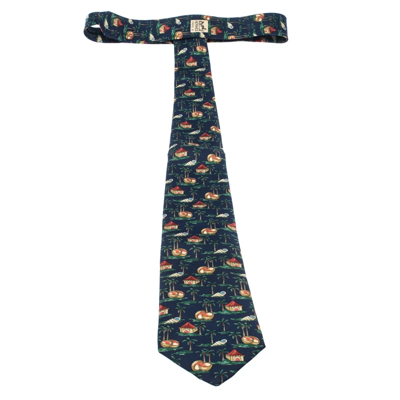 Speak luxury through your choice of accessories with this blue tie from Hermes. It has been cut from silk and designed with tropical prints all over and the label with the keeper loop on the back.