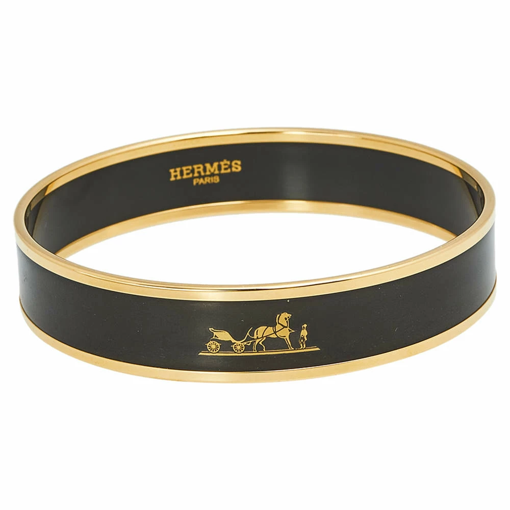 Beautify your wrist with this stunner of a bracelet from Hermes. The piece has been crafted from gold-plated metal and has black enamel coating on the exterior. This bracelet is complete with the iconic label at the front and on the inside of this bangle bracelet.
