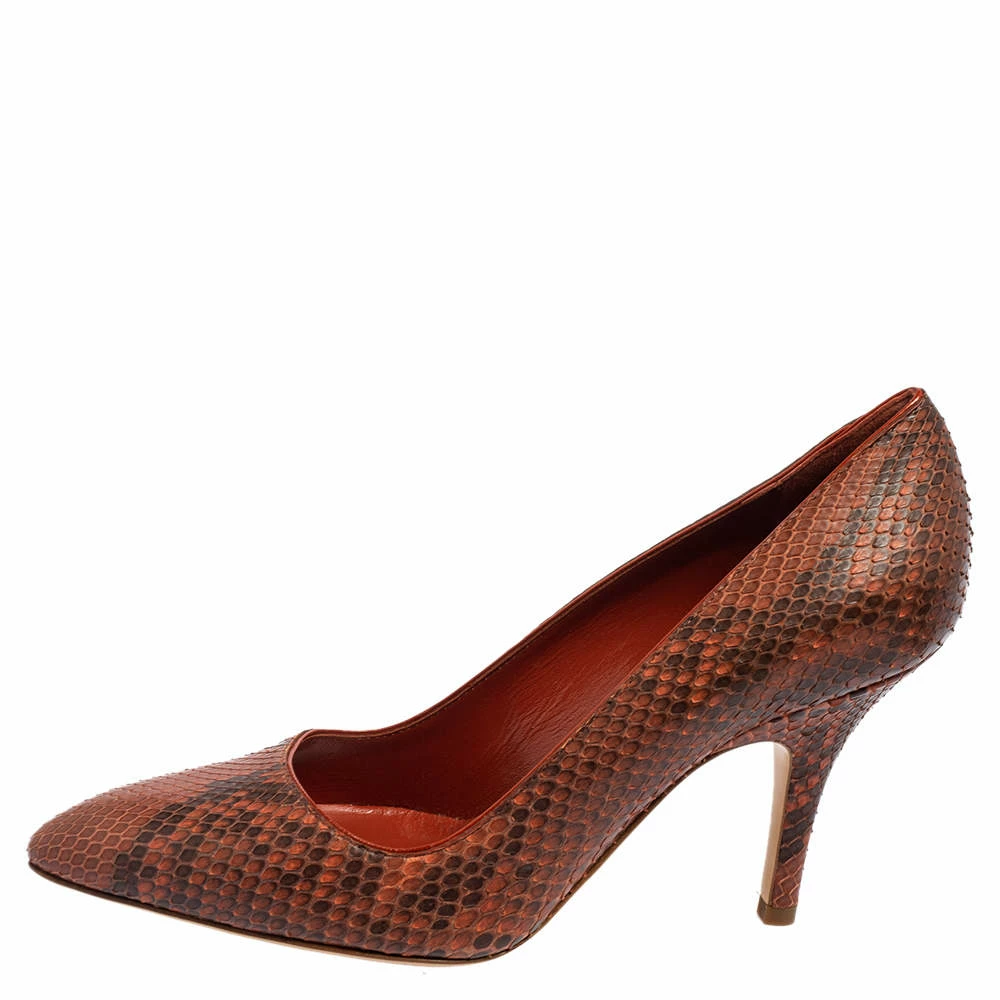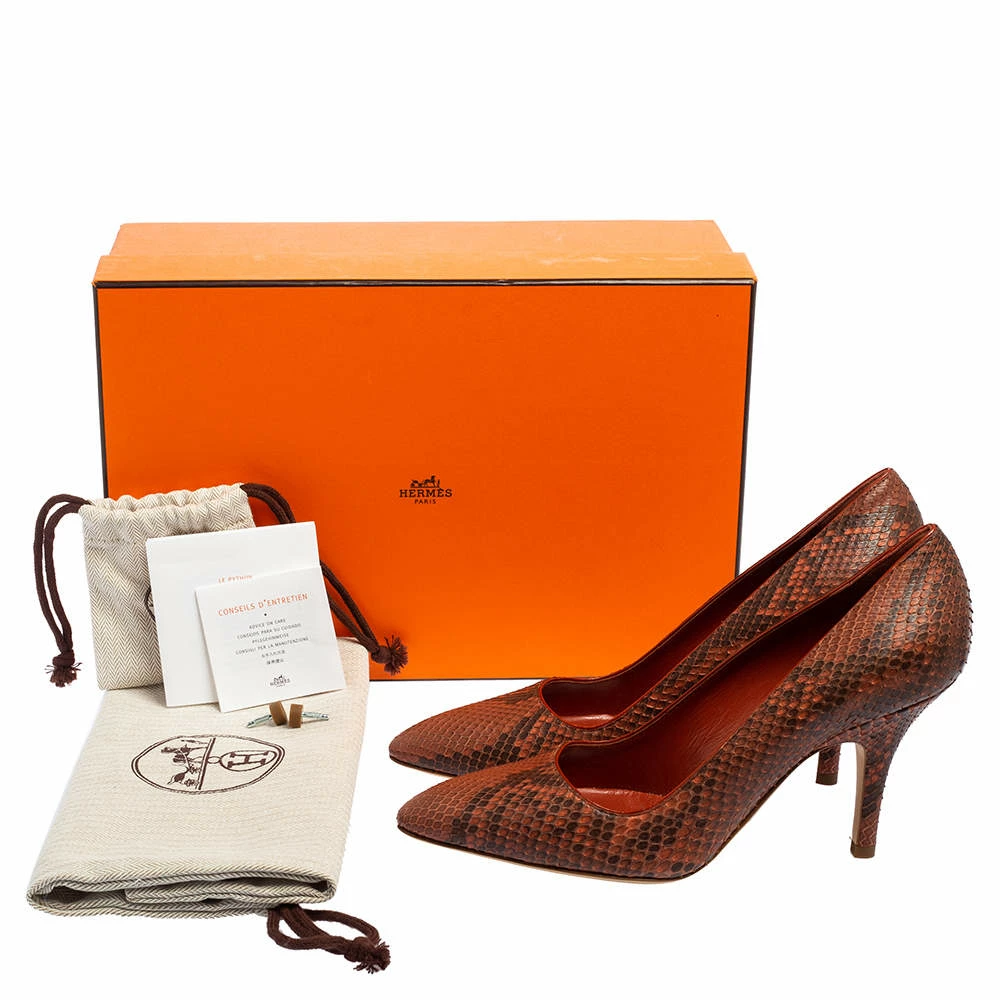 These stunning pumps coming from the House of Hermés are made to offer nonpareil style and luxury. They are designed using Cinnamon brown python leather on the exterior, which grants them an exceptional appearance. They flaunt pointed toes, an enchanting shape, and pointy heels.