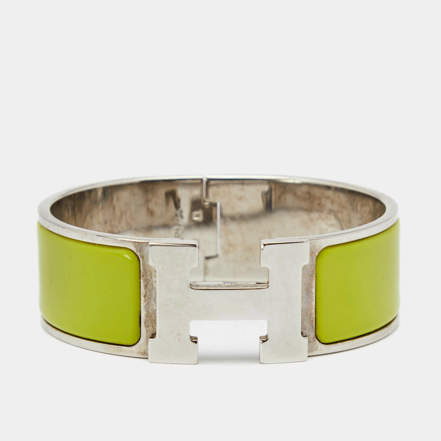Adorn your wrist with this stunner of a bracelet from Hermès. The piece is from their Clic Clac H collection and it has been crafted from palladium-plated metal and designed with neon green enamel. This bracelet is complete with the iconic H. Get those compliments you longed for as you pair it with your everyday outfits!