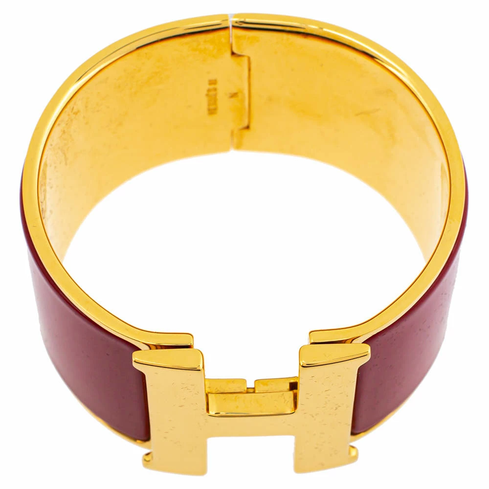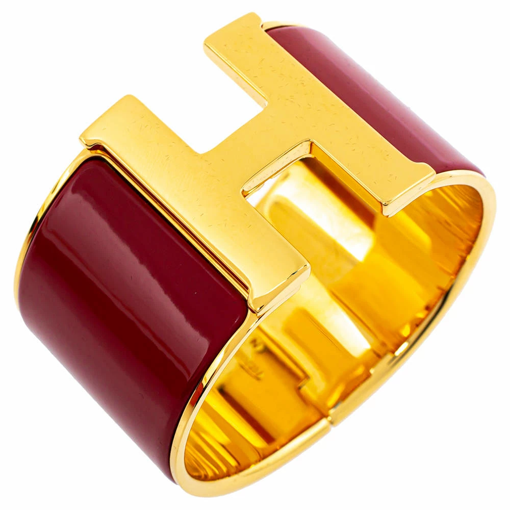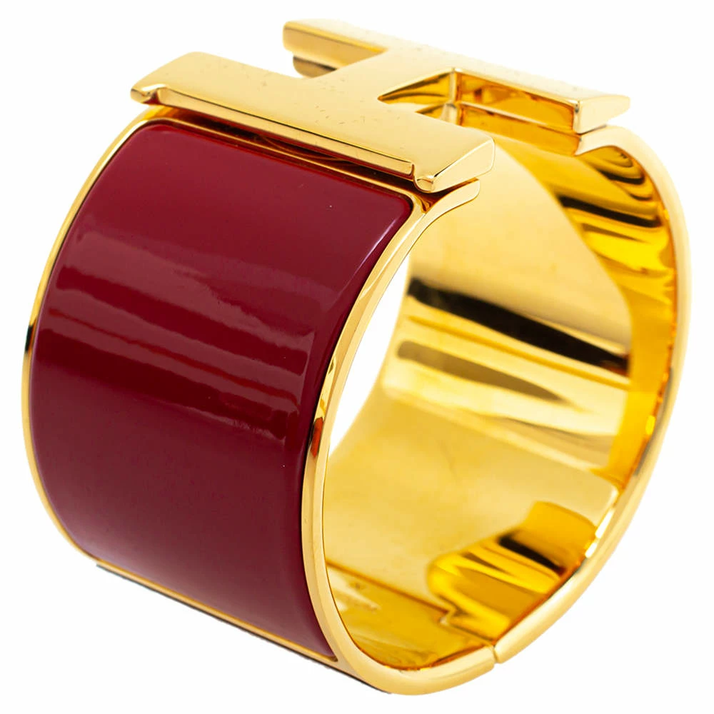Take your look to the next level with this Hermes beauty that has a new take on the classic Clic Clac H bracelet. Released in 2010, this wide bracelet is designed with red enamel and gold-plated metal, featuring an enameled “H” hook closure that makes it stand out.