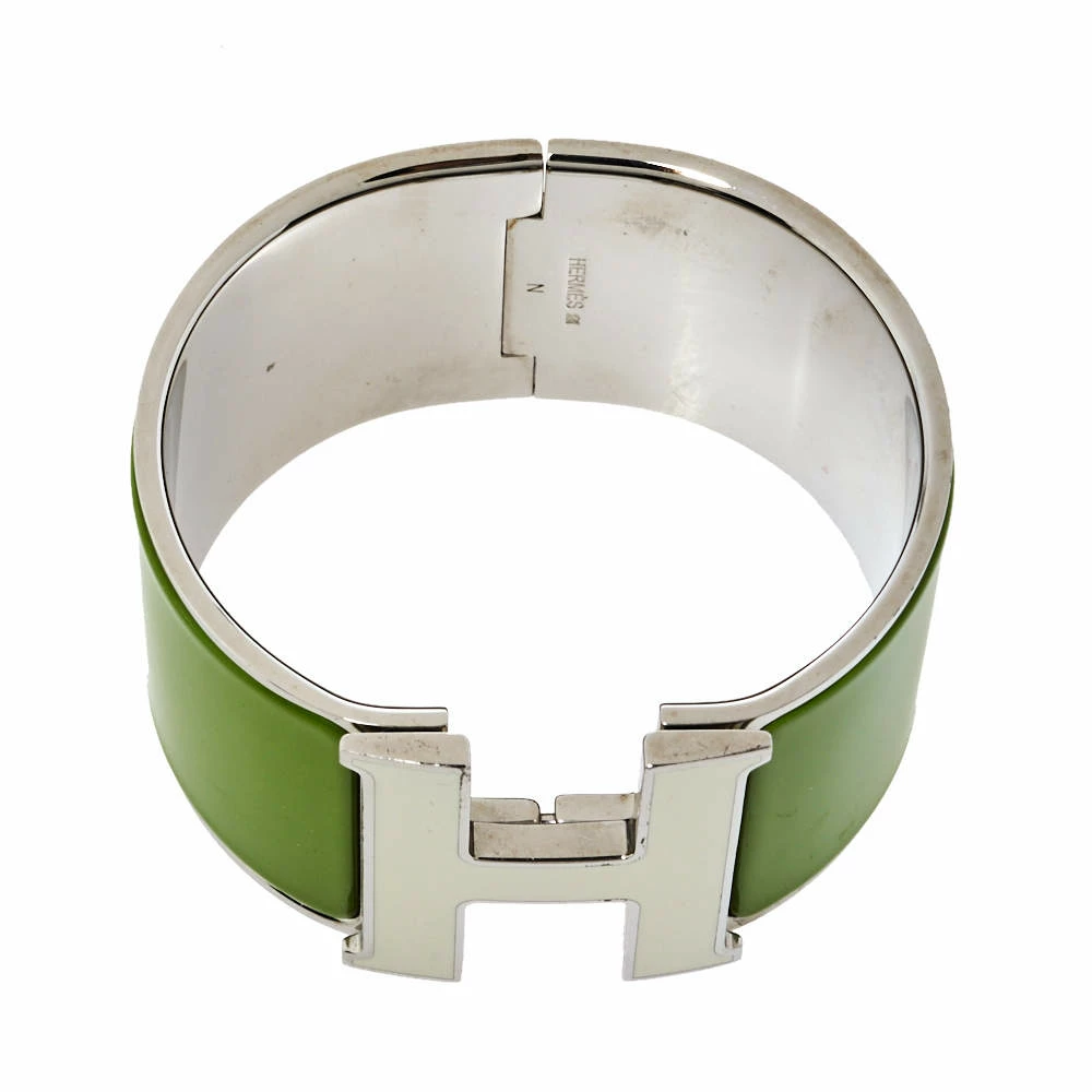 A simple yet luxuriously stylish piece from the house of Hermès, this Clic Clac H extra wide bracelet is a statement piece in itself. Constructed in palladium-plated metal, this bracelet features a green enameled cuff with a white lacquered H in the center that instantly stands out with the signature look.