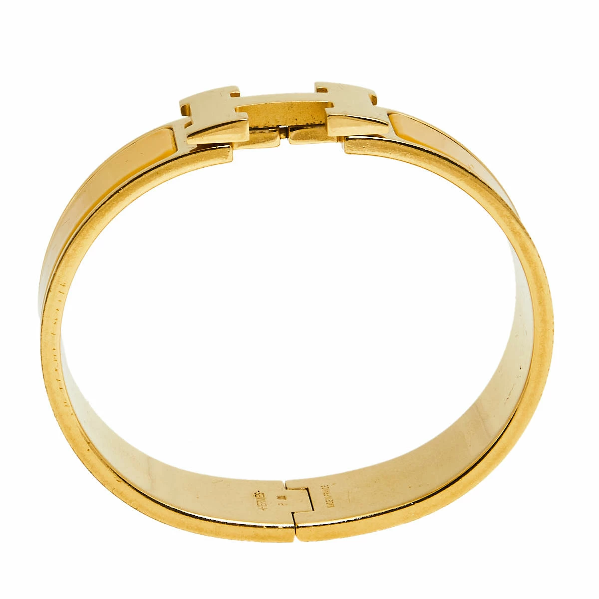 This elegant ‘Clic Clac H’ bracelet from the house of Hermès is designed in a wide silhouette. It features a gold-plated body with yellow enamel on it and the iconic ‘H’ logo at the center. Wear it with your favorite watch or as a solo piece.