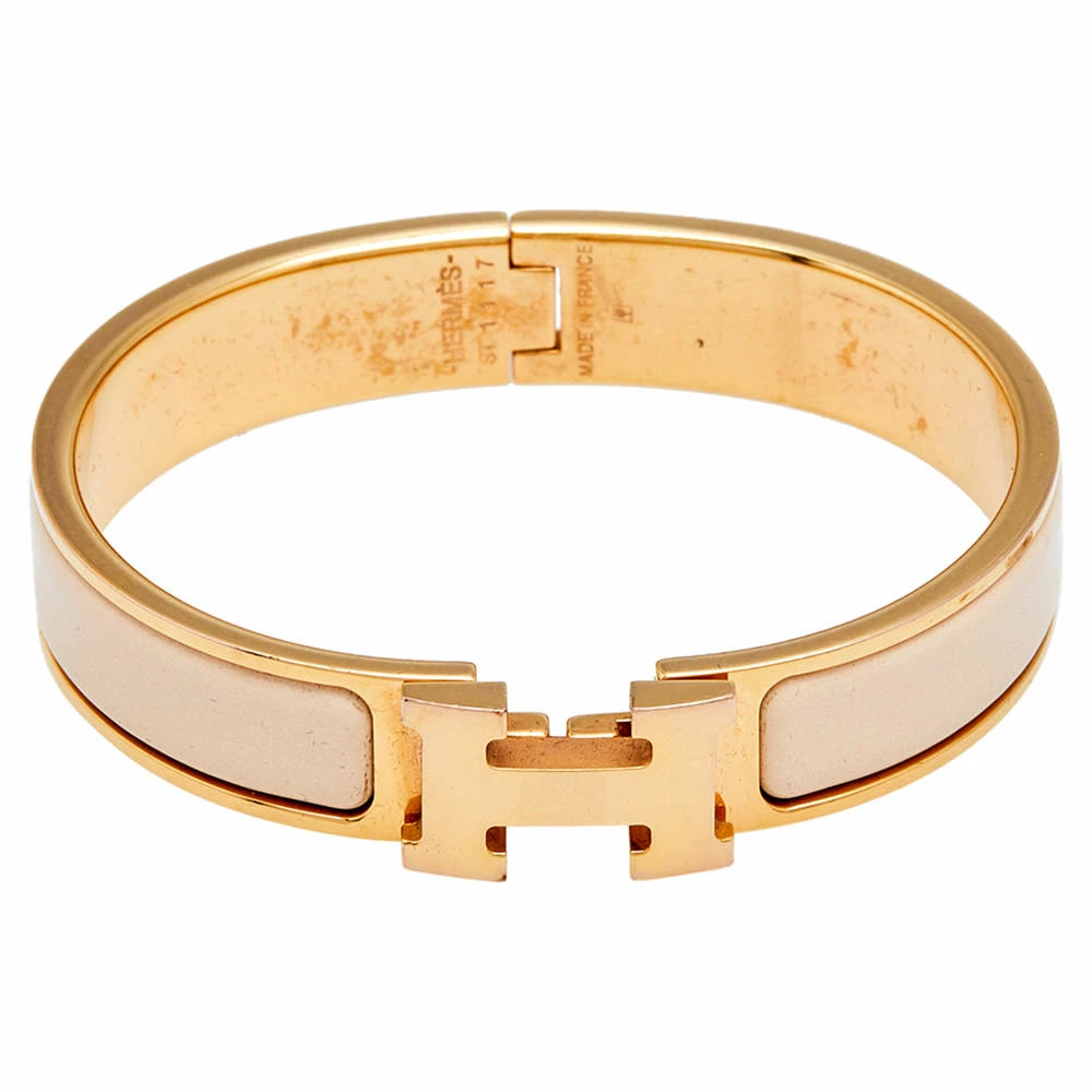 Adorn your wrist with this lovely bracelet from Hermès. The piece is from their Clic H collection and it has been crafted from rose gold-plated metal and designed with cream-hued enamel. This bracelet is complete with the iconic H.