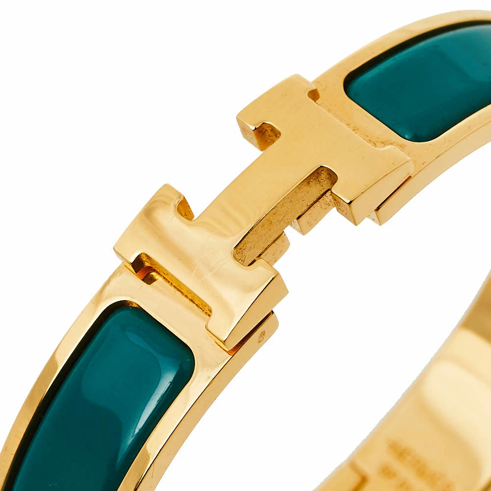 Adorn your wrist with this stunner of a bracelet from Hermes. The piece is from their Clic H collection, and it has been crafted from gold-plated metal and designed with green enamel. This bracelet is complete with the iconic H to the front.