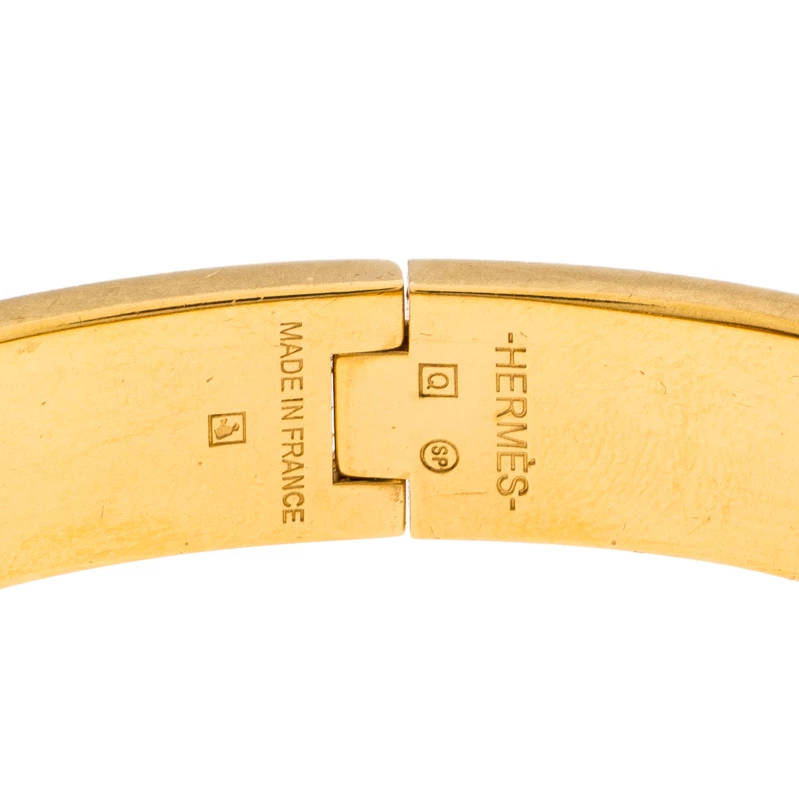One of the most popular designs from Hermes when it comes to accessories is the Clic Clac H. The Clic Clac H collection is a hit amongst fashionable women and it’s time you have one yourself. This piece is crafted from gold-plated metal and designed with red enamel and a swivel H.