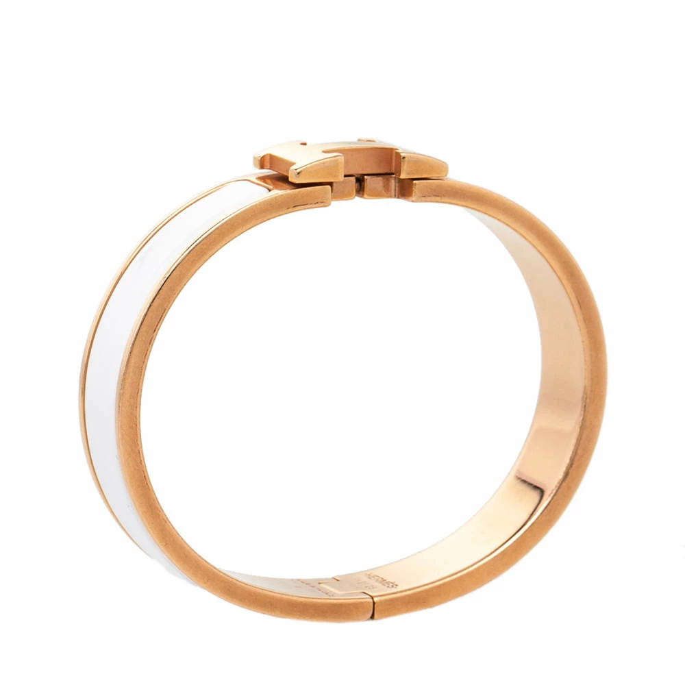 Adorn your wrist with this stunner of a bracelet from Hermes. The piece is from their Clic H collection, and it has been crafted from gold-plated metal and designed with white enamel. This bracelet is complete with the iconic H to the front.