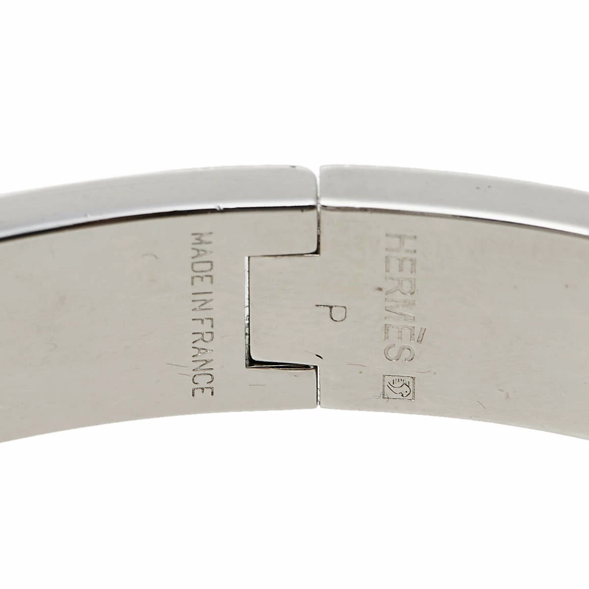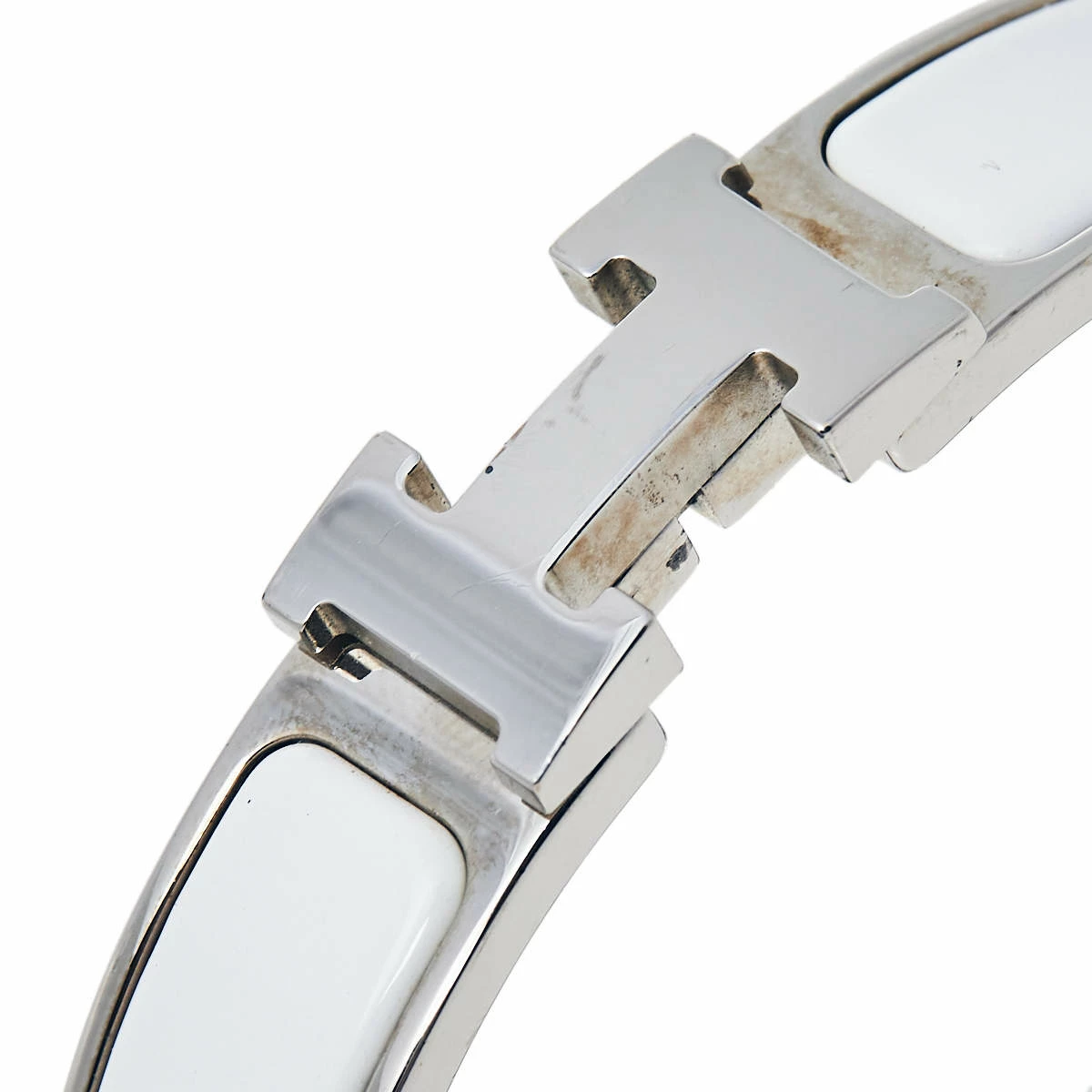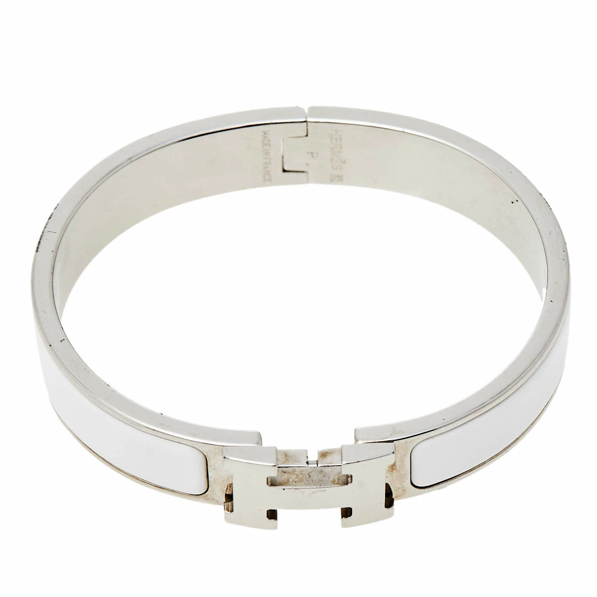 Adorn your wrist with this stunner of a bracelet from Hermes. The piece is from their Clic H collection, and it has been crafted from palladium-plated metal and designed with white enamel. This bracelet is complete with the iconic H to the front. Get those compliments you longed for as you pair it with your everyday outfits!